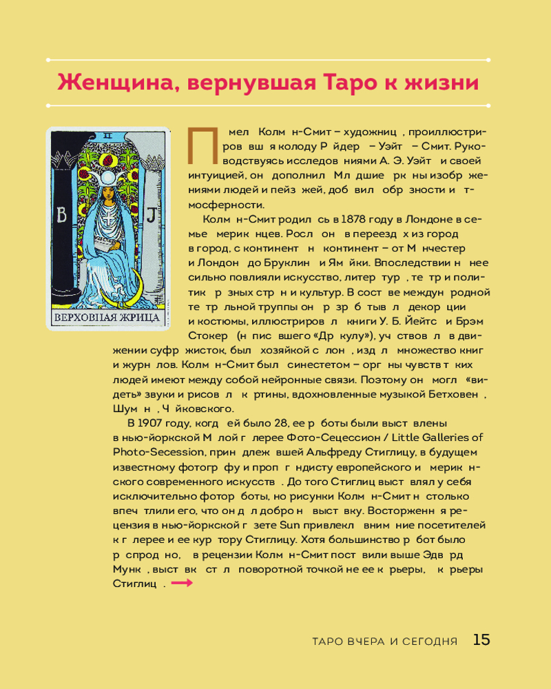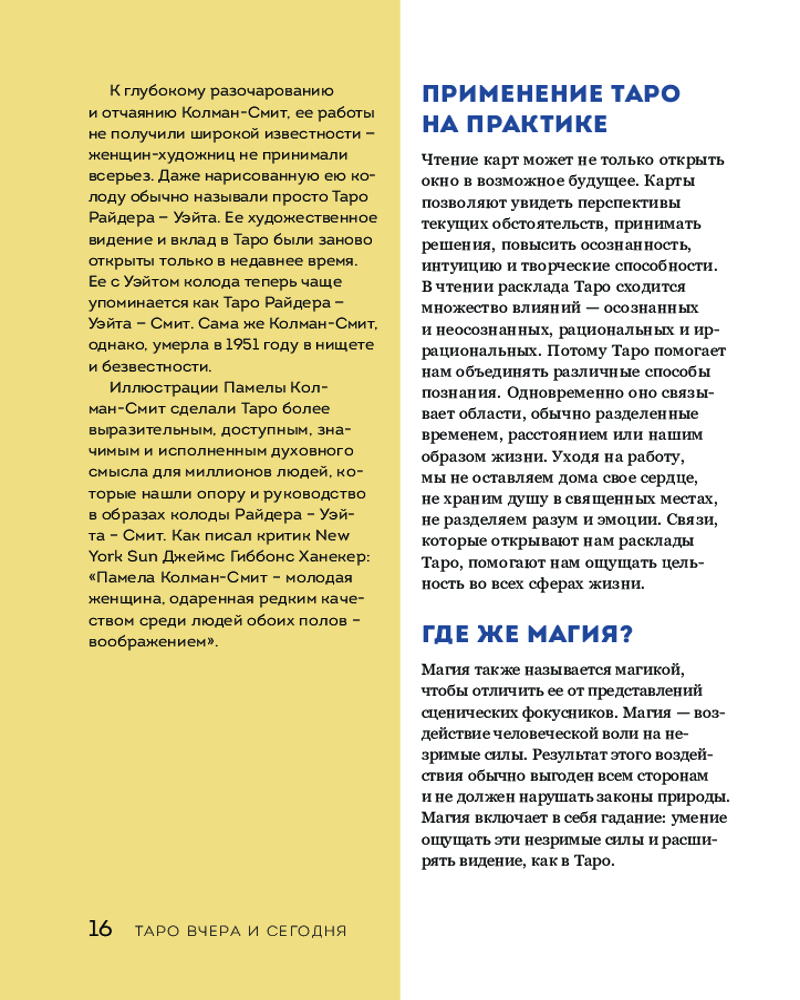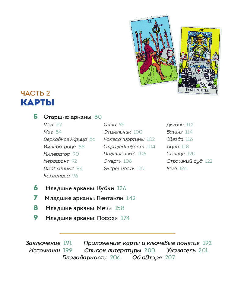 • изучите значения карт — здесь вы найдете детальные описания всех Старших и Младших арканов, которые не только помогут вам освоить классическое Таро Уэйта, но и работать с любой колодой, следующей традиции Таро Артура Уэйта и Памелы Колман Смит;