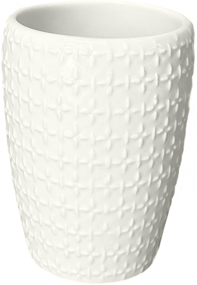 Стакан для зубных щеток «Topaz» позволит удобно разместить принадлежности на полочке в ванной. Стакан для щеток из керамики округлой формы с выпуклым узором выполнен в белом цвете с нежным кремовым оттенком. Позволяет разместить в нем зубные щетки нескольких членов семьи. Керамический стакан для ванной устойчив к влажной среде.