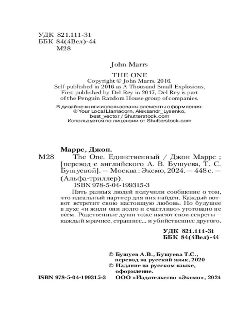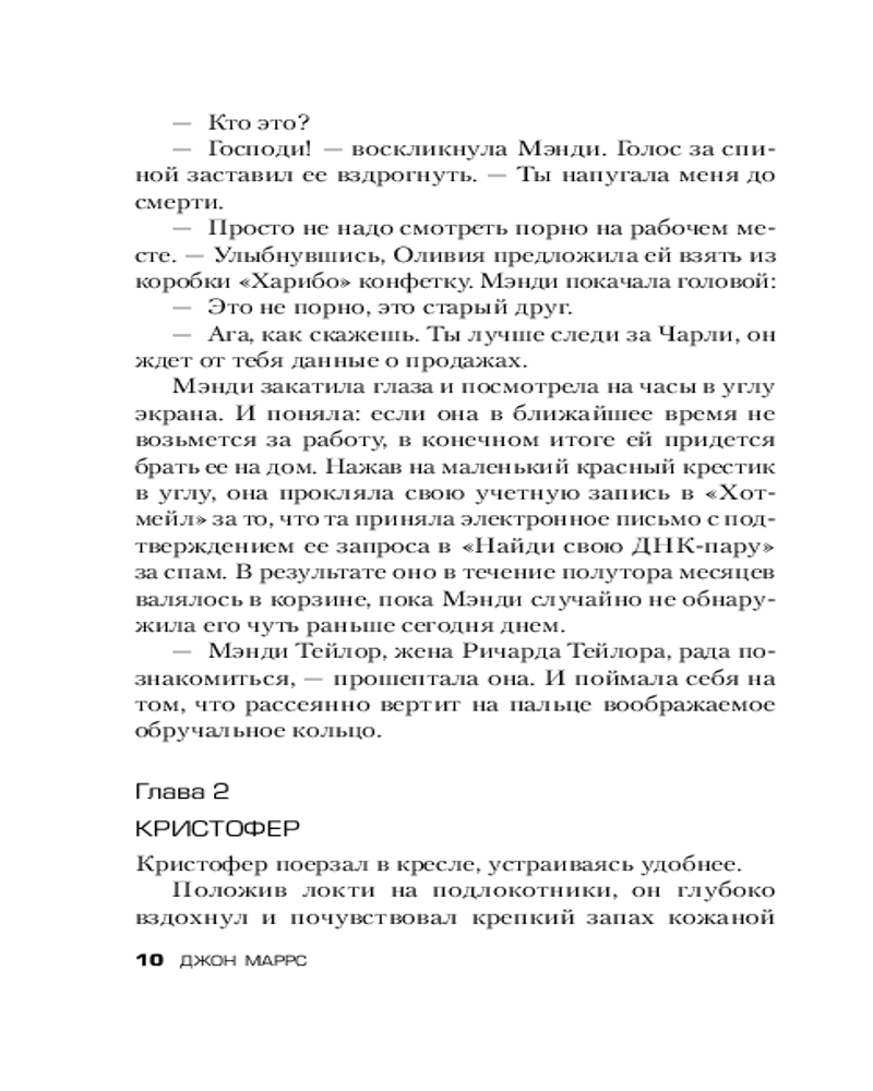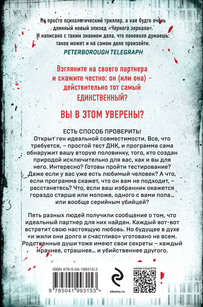 В данный момент этот товар отсутствует в продаже. Возможно, у нас найдется аналогичный или похожий товар здесь. Серия: Альфа-триллер (клатчбук) Есть способ проверить! Открыт ген полной совместимости. Все, что требуется — простой тест ДНК, и программа сама обнаружит вашу вторую половинку, того, кто создан природой исключительно для вас, — как и вы для него. Интересно? Готовы пройти тестирование? Даже если у вас уже есть любимый человек? А что, если программа скажет, что он вам не подходит, — расстанетесь? Что, если ваш избранник окажется гораздо старше или моложе, одного с вами пола... или вообще серийным убийцей?