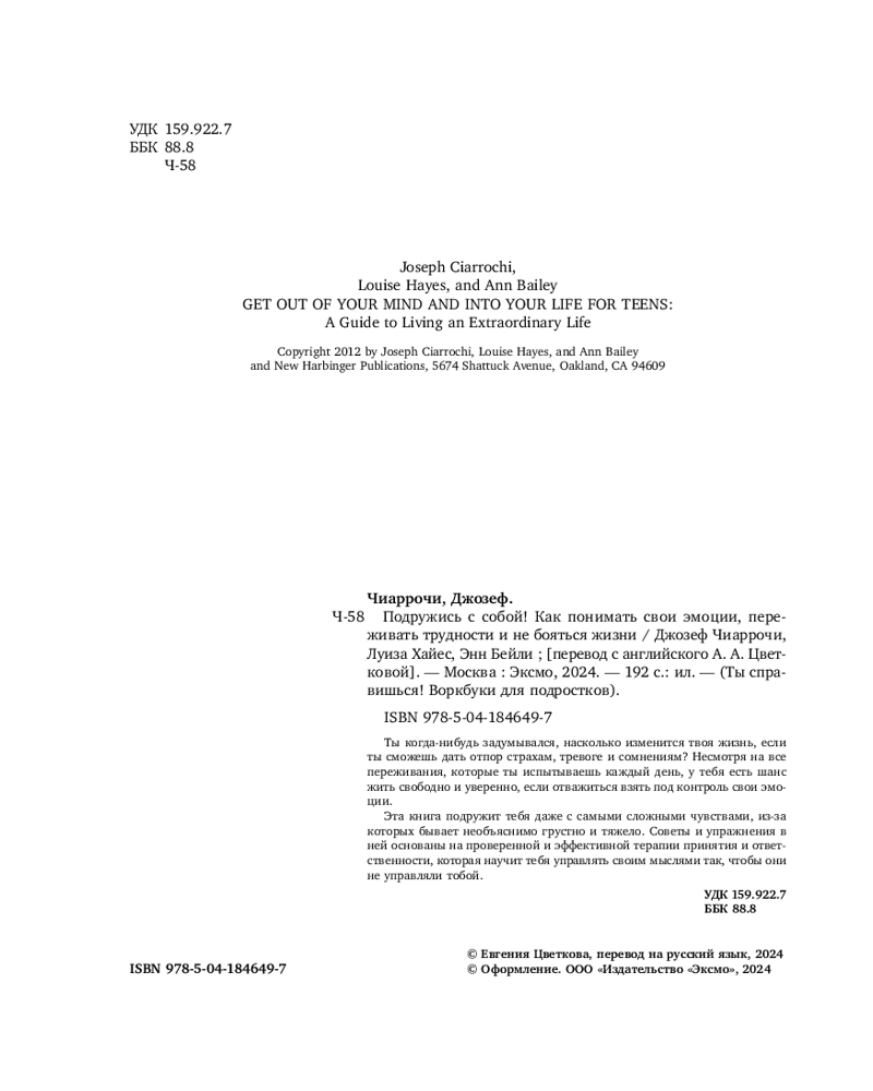 💳 Оплатить за товар можно при получении 🇰🇿 Есть бесплатная доставка по Казахстану 🎁 Копите бонусы с каждой покупки Серия: Ты справишься! Воркбуки для подростков Ты когда-нибудь задумывался, насколько изменится твоя жизнь, если ты сможешь дать отпор страхам, тревоге и сомнениям? Несмотря на все переживания, которые ты испытываешь каждый день, у тебя есть шанс жить свободно и уверенно, если отважиться взять под контроль свои эмоции. Эта книга подружит тебя даже с самыми сложными чувствами, из-за которых бывает необъяснимо грустно и тяжело. Советы и упражнения в ней основаны на проверенной и эффективной терапии принятия и ответственности, которая научит тебя управлять своим мыслями так, чтобы они не управляли тобой. Нет лучшего времени, чтобы открыть все это для себя, чем сейчас! |