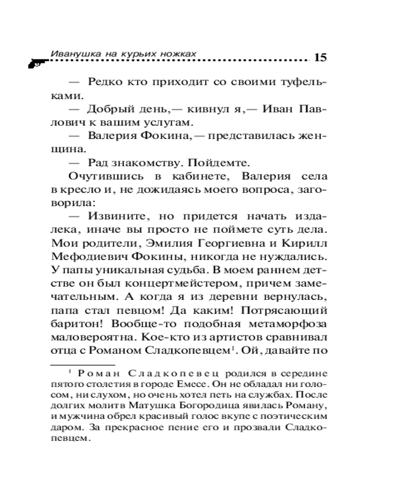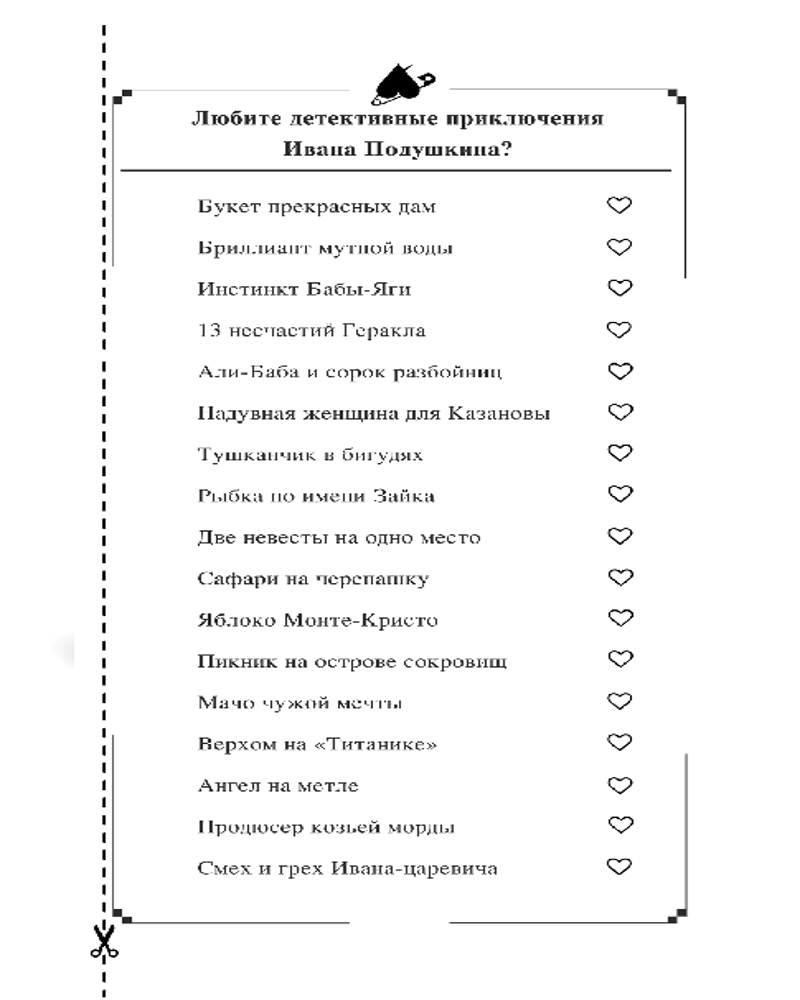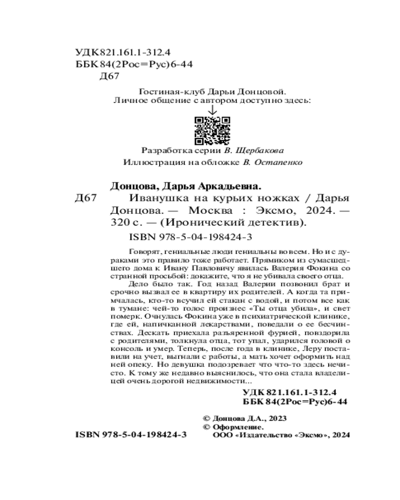 Иванушка на курьих ножкахВ данный момент этот товар отсутствует в продаже. Возможно, у нас найдется аналогичный или похожий товар здесь. Серия: Иронический детектив (обложка) Говорят, гениальные люди гениальны во всем. Но и с дураками это правило тоже работает. Прямиком из сумасшедшего дома к Ивану Павловичу явилась Валерия Фокина со странной просьбой: докажите, что я не убивала своего отца. Дело было так. Год назад Валерии позвонил брат и срочно вызвал ее в квартиру их родителей. А когда та примчалась, кто-то всучил ей стакан с водой, и потом все как в тумане: чей-то голос произнес «Ты отца убила», и свет померк. Очнулась Фокина уже в психиатрической клинике, где ей, напичканной лекарствами, поведали о ее бесчинствах. Дескать, приехала разъяренной фурией, повздорила с родителями, толкнула отца, тот упал, ударился головой о консоль и умер. Теперь, после года в клинике, Леру поставили на учет, выгнали с работы, а мать хочет оформить над ней опеку. Но девушка подозревает, что что-то здесь нечисто. К тому же недавно выяснилось, что она стала владелицей очень дорогой недвижимости... |