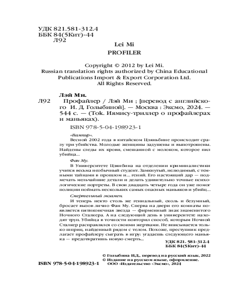 💳 Оплатить за товар можно при получении 🇰🇿 Есть бесплатная доставка по Казахстану от 1 дня 🎁 Копите бонусы с каждой покупки Серия: Tok. Иямису-триллер о профайлерах и маньяках (клатчбук) Фан Му. В Университете Цзянбина на отделении криминалистики учится весьма необычный студент. Замкнутый, нелюдимый, с темными тайнами в прошлом и... гений. Его настоящий дар: подмечать мельчайшие детали и делать удивительно точные психологические портреты. В свои двадцать четыре года он уже помог полиции поймать нескольких самых опасных маньяков и убийц... |