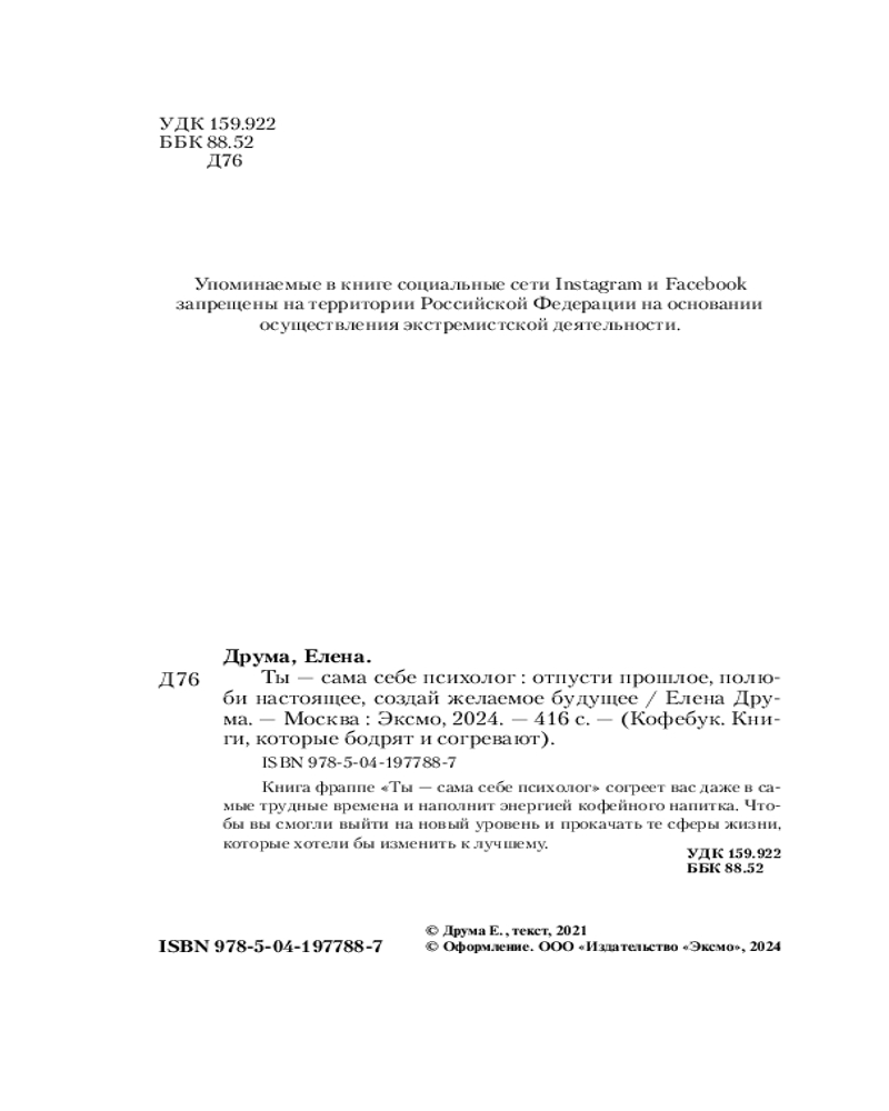 💳 Оплатить за товар можно при получении 🇰🇿 Есть бесплатная доставка по Казахстану от 1 дня 🎁 Копите бонусы с каждой покупки Серия: Кофебук. Книги которые бодрят и согревают Книга фраппе «Ты — сама себе психолог» согреет вас даже в самые трудные времена и наполнит энергией кофейного напитка. Чтобы вы смогли выйти на новый уровень и прокачать те сферы жизни, которые хотели бы изменить к лучшему. Лена Друма, практикующий гештальт-терапевт и психолог, приготовила авторские практики, психологические приемы, тесты. С этой книгой вы станете психологом, подругой и наставником для самой себя. Она поможет вам открыть новые возможности и взять от жизни максимум. |