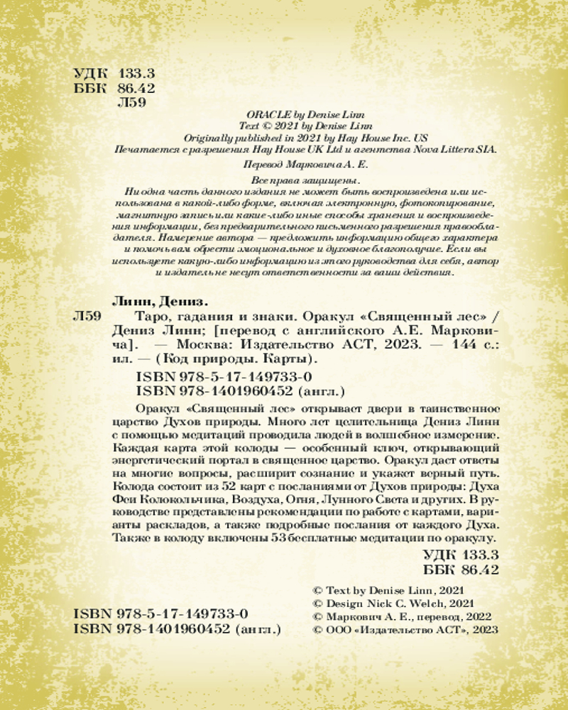 Серия: Код природы. Карты. Подарочная коробка с магнитным клапаном и лентой-закладкой Дениз Линн — всемирно известный преподаватель в области саморазвития. Она проводит сессии-медитации, практики по фэн-шуй, очистки пространства, коучинга, сноведений и многого другого. |