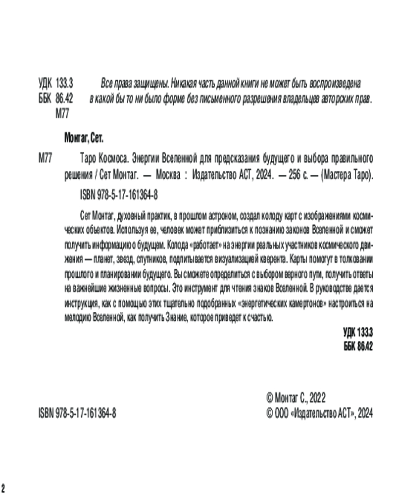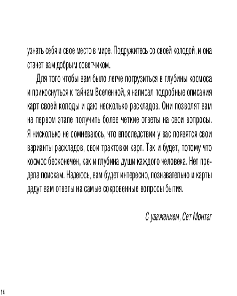Серия: Монтаг Сет Сет Монтаг, бывший астроном, а ныне духовный практик, создал колоду карт, используя изображения космических объектов. Через энергии реальных участников космического движения человек может приблизиться к познанию законов Вселенной и получить информацию о будущем. Вам откроются знаки Вселенной. Карты подойдут для толкования прошлого и планирования будущего, помогут определиться с выбором личного пути. |