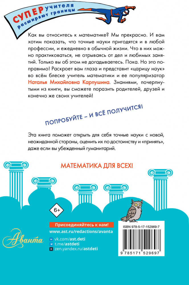 💳 Оплатить за товар можно при получении 🇰🇿 Есть бесплатная доставка по Казахстану 🎁 Копите бонусы с каждой покупки Серия: СУПЕРучителя спешат на помощь Пришиваем ли мы пуговицу, наряжаем ли новогоднюю елку, режем ли картошку к ужину — везде сталкиваемся с математикой! Не верите? А зря! Думаете, что гуманитариям не нужна алгебра с геометрией? А как вам уроки точных наук от Шекспира, Пушкина, Льва Толстого? Или от великих художников — Дюрера, Леонардо да Винчи, музыканта Моцарта или философ Платона? Мы уже не говорим об Архимеде и Гауссе, которых отличала невероятная смелость фантазии. Вот в компании знаменитых личностей мы и предлагаем вам подумать о различных задачах и, конечно, попробовать их решить. Уверены, что вы оцените красоту «царицы наук» и поверите в свои силы, ведь математике подвластно все! Для среднего и старшего школьного возраста. |