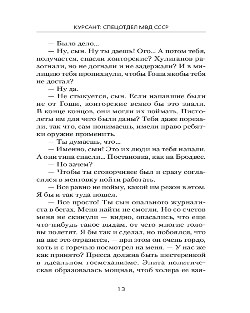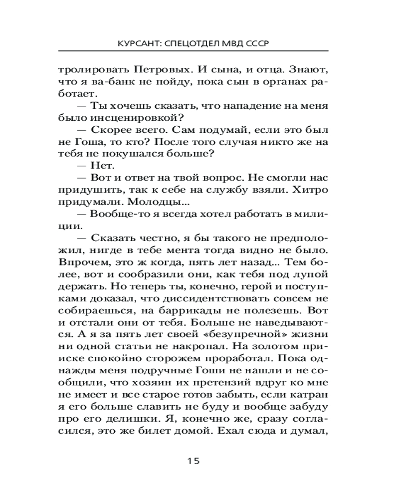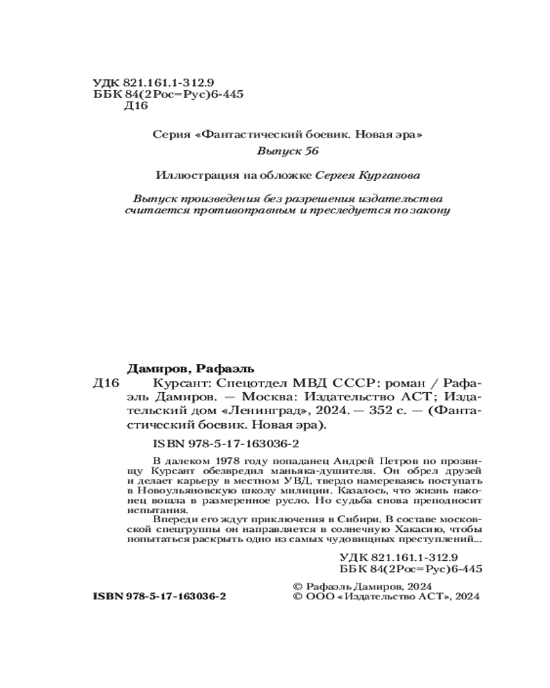 💳 Оплатить за товар можно при получении 🇰🇿 Есть бесплатная доставка по Казахстану от 1 дня 🎁 Копите бонусы с каждой покупки Серия: Фантастический боевик. Новая эра В далеком 1978 году попаданец Андрей Петров по прозвищу Курсант обезвредил маньяка-душителя. Он обрел друзей и делает карьеру в местном УВД, твердо намереваясь поступать в Новоульяновскую школу милиции. Казалось, что жизнь наконец вошла в размеренное русло. Но судьба снова преподносит испытания. Впереди его ждут приключения в Сибири. В составе московской спецгруппы он направляется в солнечную Хакасию, чтобы попытаться раскрыть одно из самых чудовищных преступлений... |
