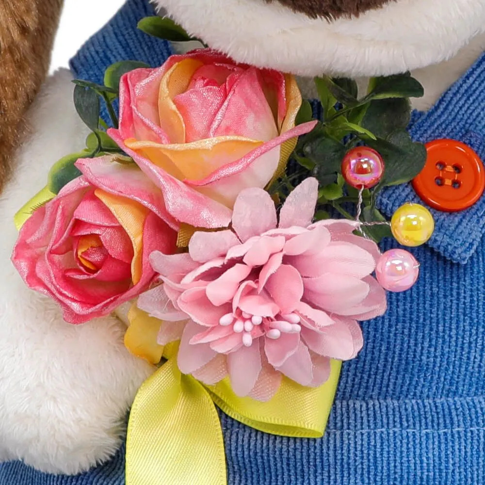 Бартоломей в стильном комбинезоне из микровельвета лазурного цвета. Комбинезон сшит с грудкой и на лямочках с алыми пуговками. В лапках у Барта нежный букетик, перевязанный атласной лентой лимонного цвета.