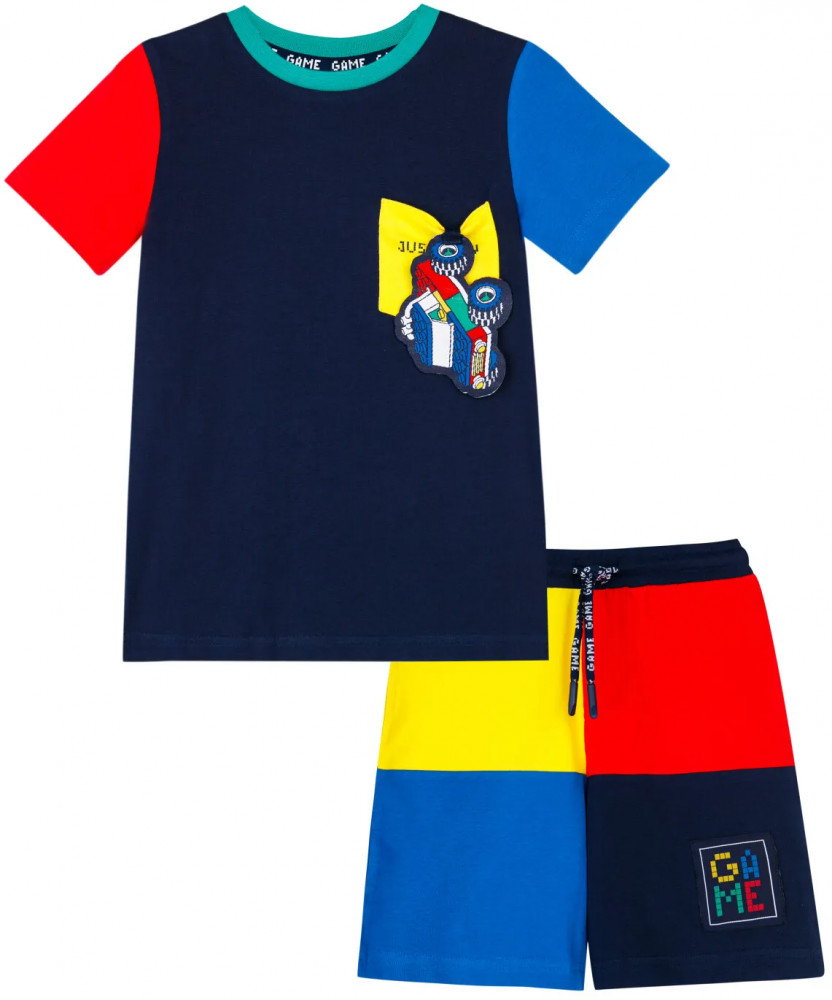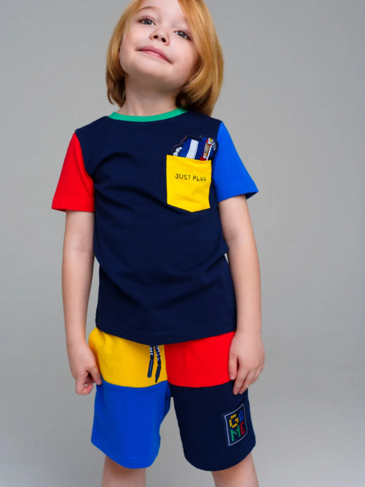 Комплект трикотажный: футболка, шорты. Высокое содержание хлопка 95%. Благодаря наличию эластана в составе ткани изделие проще в уходе и держит форму. Оптимальная посадка: шорты не сползают при движении. Эластичный пояс со шнурком. Карманы.