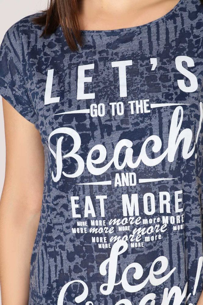 Прохладный стиль туники «Ice Cream» разбавит домашний гардероб девушки или молодой женщины. Изделие изготовлено из легкого воздушного материала — кулирка. Главной изюминкой в фасоне является подол, выполненный в виде бахромы. Рукав короткий, слегка прикрывающий плечи. Узор напоминает рябь на водной глади. На груди светлая надпись. Освежающая модель для жаркой погоды подчеркнет все достоинства фигуры.
