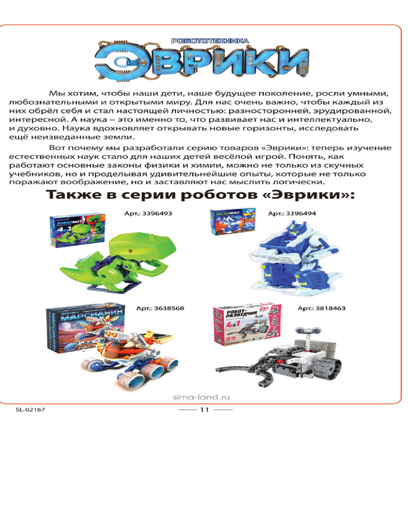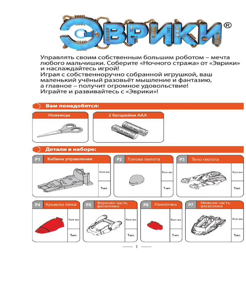 💳 Оплатить за товар можно при получении 🇰🇿 Есть бесплатная доставка по Казахстану от 1 дня 🎁 Копите бонусы с каждой покупки Серия: Робототехника Управлять своим собственным большим роботом — мечта любого мальчишки. Соберите «Ночного стража» от «Эврики» и наслаждайтесь игрой! Играя с собственноручно собранной игрушкой, ваш маленький учёный разовьёт мышление и фантазию, а главное — получит огромное удовольствие! Играйте и развивайтесь с «Эврики»! |