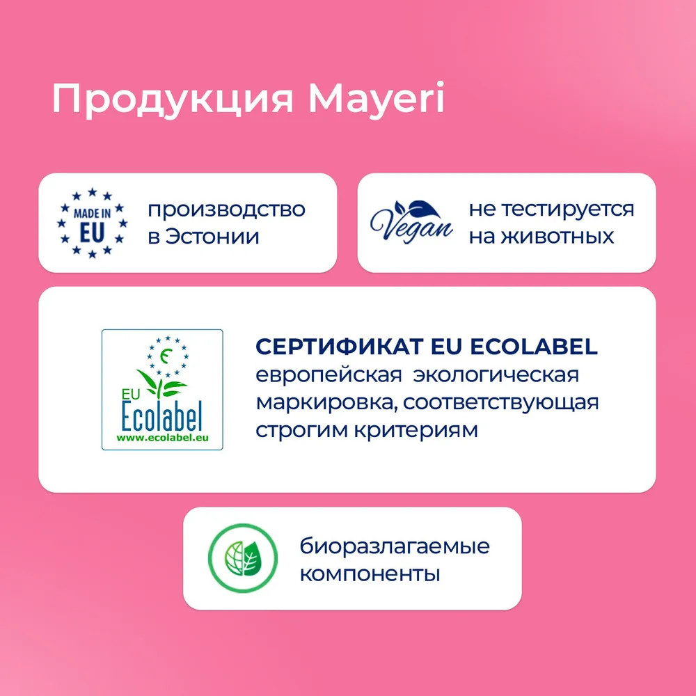 Бренд «Mayeri» ценит окружающую среду и её защиту. Продукция «Mayeri» не тестируется на животных и не содержит искусственных красителей и ароматизаторов. «Mayeri» — эстонский бренд экологичной бытовой химии.