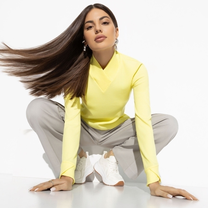 Заказывала в другом цвете 44 - маловат получился. В желтом цвете 46 размер - ткань потоньше и тянется лучше. Можно было бы и 44 размер заказать.