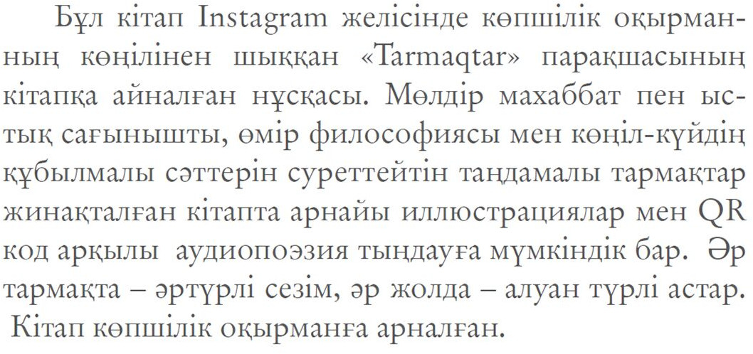 Серия: Прочее Бул кітап Instagram желісінде копілік окырман-нын конілінен шыккан «Tarmaqtar» парактасьнын кітапка айналган пускасы. Молдір махаббат пен вс-тык сагынышиты, омір философиясы мен коніл-куйдін кубылмалы соттерін суреттейтін тандамалы тармактар жинакталган кітапта арнайы иллюстрациялар мен QR код аркылы аудиопоэзия тындауга мумкіндік бар. Эр тармакта — ортурлі сезім, эр жолда — алуан турлі астар. |