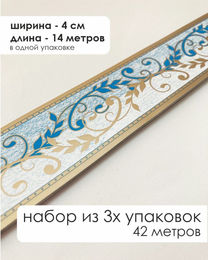 В набор входит 3 упаковки бордюра. В одной упаковке 20 лент по 70 см — общей длиной бордюра 14 метров. Ширина бордюра — 4 см. С помощью бордюра для обоев можно скрыть небольшие недостатки стен и других подобных поверхностей, а также поэкспериментировать с зонированием и сочетаниями обоев разных расцветок и стилей. Бордюр для стен не только оживит интерьер, но сделает его интересным, уютным и оригинальным.