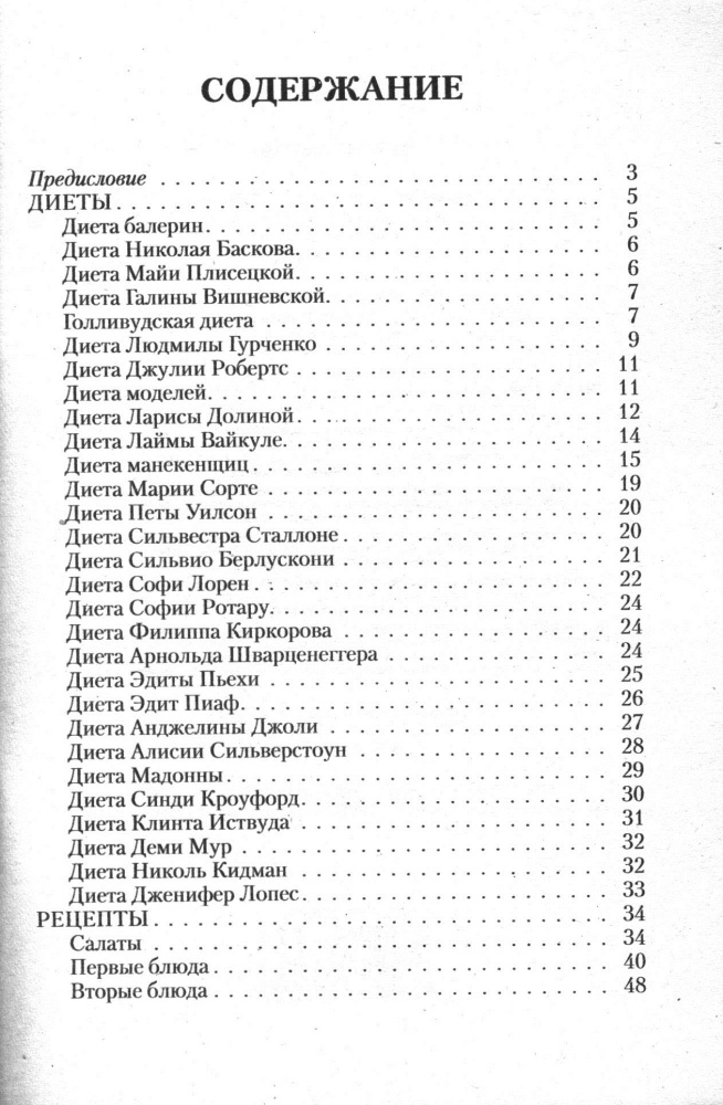 В такой "малюсенькой" книжечке собраны самые-самые диеты звезд - как наших, так и зарубежных - от Майи Плисецкой - до Мадонны!!! В конце есть рецепты всяческих блюд - от каши до супов и салатов!!! Я в восторге!!!