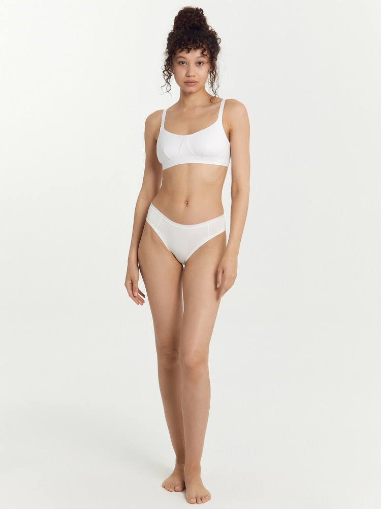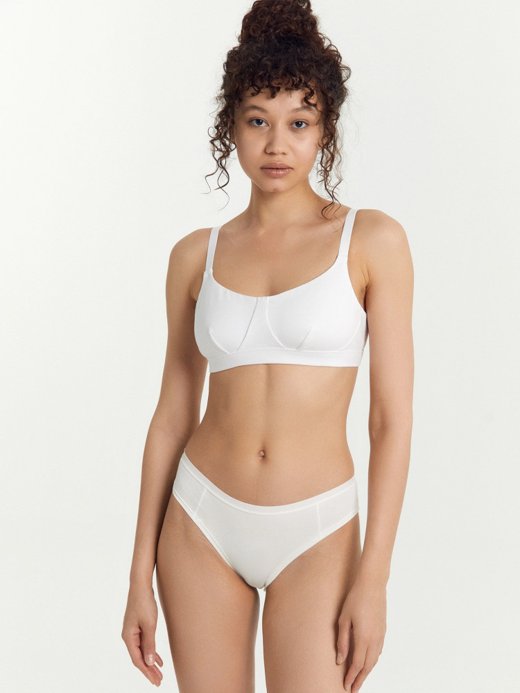 из трикотажного полотна,бретели регулируются,снизу плотная,широкая эластичная лента.Без уплотнителя,с изнанки тонкий бельевой трикотаж.