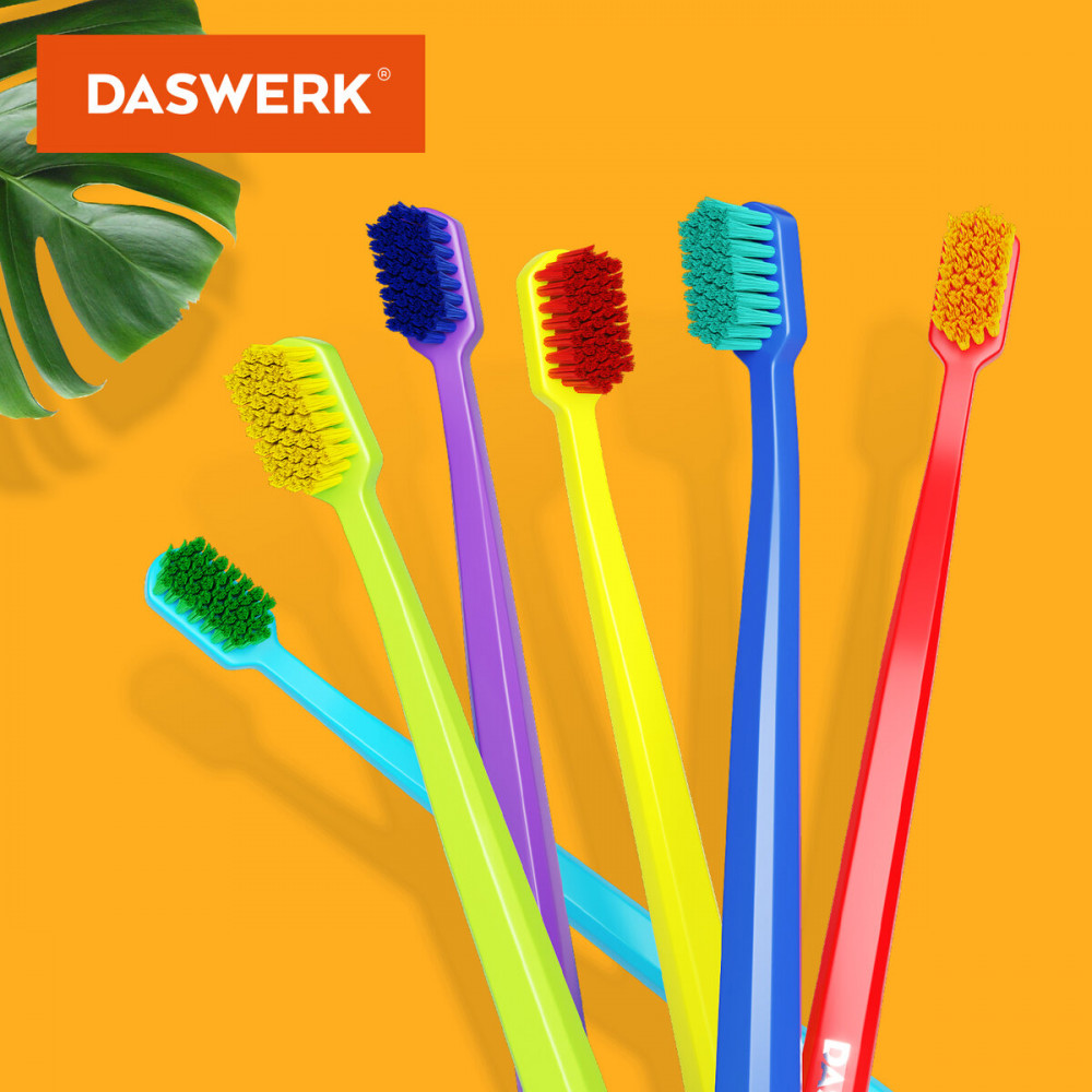 Зубные щётки Daswerk подойдут как взрослым, так и детям, благодаря средней жёсткости щетинок закруглённой формы, изготовленных из высококачественного нейлона 610 HOREX. Щетинки зубных щёток Daswerk, изготовленные из синтетического материала, превосходят по прочности и долговечности обычную щетину, а также препятствуют размножению микроорганизмов на поверхности щетинок. Зубные щётки Daswerk отличаются удобной пластиковой ручкой, обеспечивающей комфортный хват и предотвращающей чрезмерное давление на дёсны.