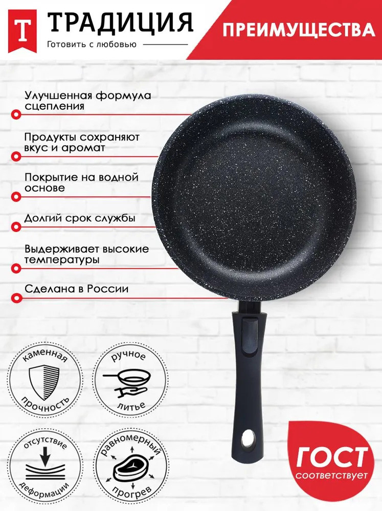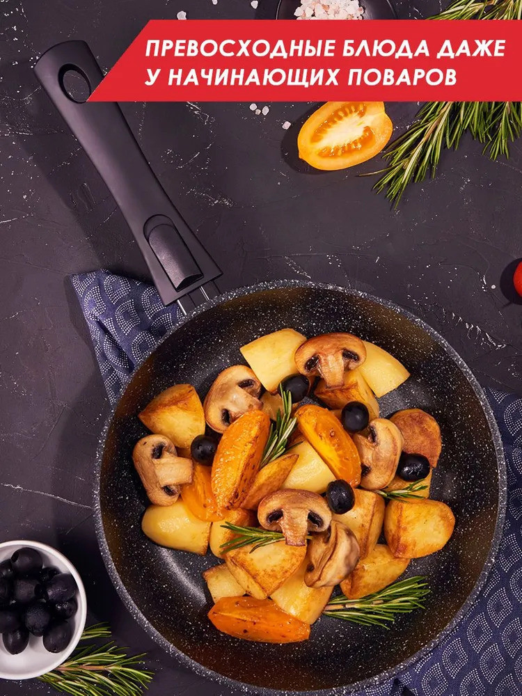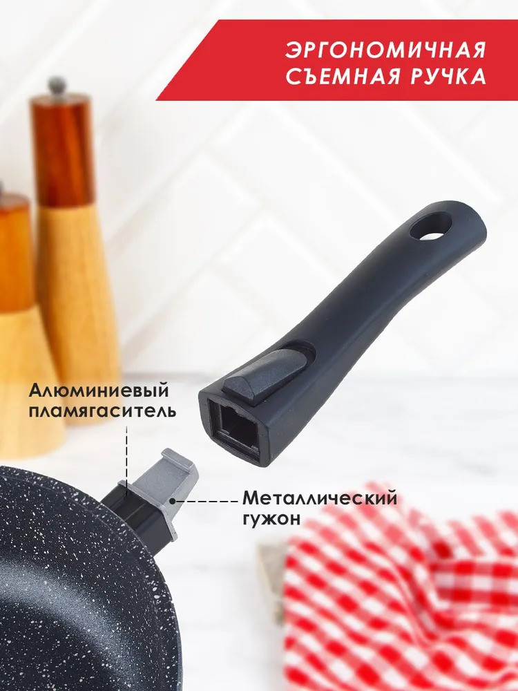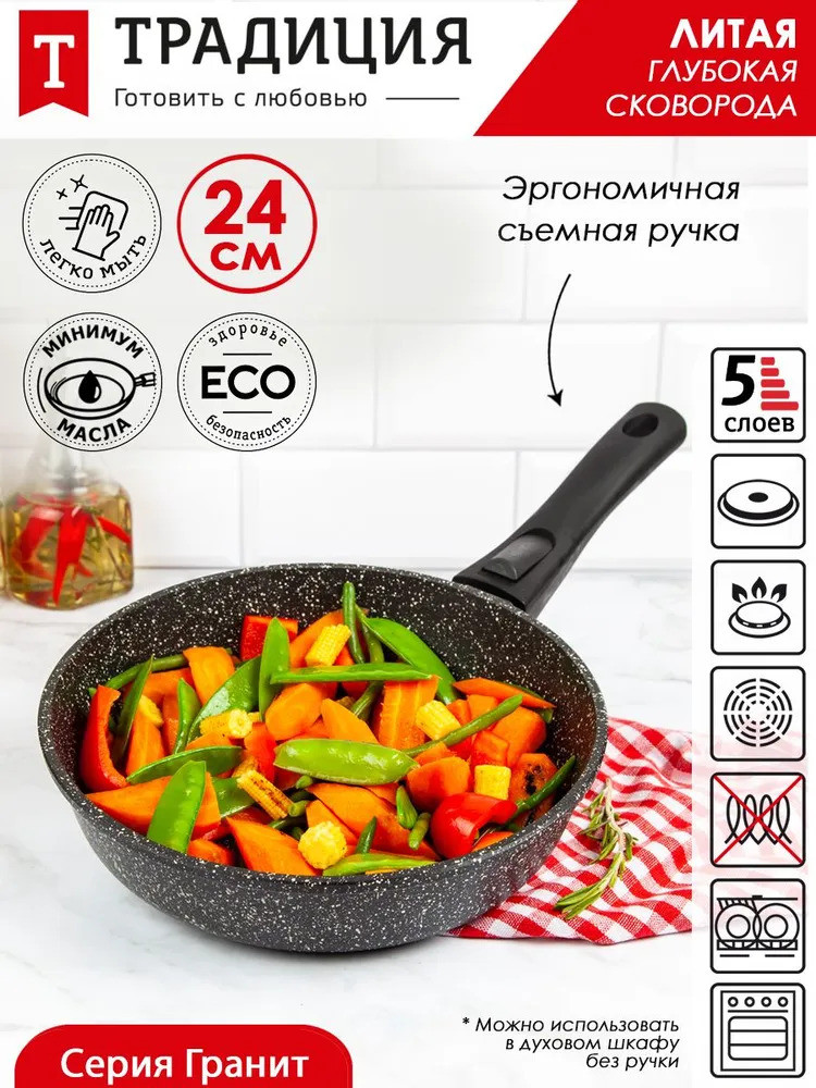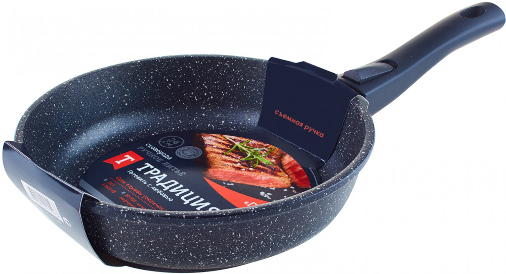 Сковорода со съемной ручкой "Гранит" 20 см. классная. Борта высокие, что делает сковороду практичной. Покупала много посуды кухонной этого бренда и очень довольна качеством.