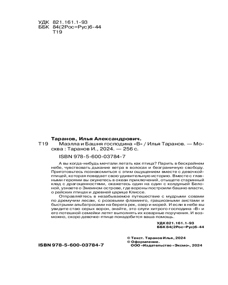 💳 Оплатить за товар можно при получении 🇰🇿 Есть бесплатная доставка по Казахстану от 1 дня 🎁 Копите бонусы с каждой покупки Серия: Финансовая грамотность для детей и подростков А вы когда-нибудь мечтали летать как птица? Парить в бескрайнем небе, чувствовать дыхание ветра в волосах и безграничную свободу. Приготовьтесь познакомиться с этим ощущением вместе с девочкой-птицей, которая поведает свою удивительную историю. Вместе с главными героями вы окунетесь в океан приключений, отыщете старинный клад с драгоценностями, окажетесь один на один с колдуньей Белоной, узнаете о Змеином острове, где вороны построили башню власти, о райских птицах и древней царице Клиссе. |