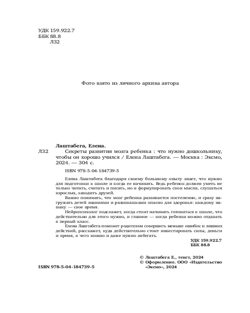 💳 Оплатить за товар можно при получении 🇰🇿 Есть бесплатная доставка по Казахстану 🎁 Копите бонусы с каждой покупки Серия: Развитие мозга ребенка по законам физиологии. Книги нейропсихолога Елены Лаштабега Детский нейропсихолог и эксперт по развитию мозга ребенка Елена Лаштабега благодаря своему большому опыту знает, что нужно для подготовки к школе и когда ее начинать. Важно понимать: мозг ребенка развивается постепенно, и сразу нагружать детей знаниями и развивашками опасно для здоровья: каждому навыку — свое время. Благодаря заданиям для проверки знаний ребенка и чек-листу вы сами сможете определить, насколько хорошо ваш ребенок готов к школе, стоит ли посещать подготовительные занятия или достаточно детского сада, и, главное — когда ребенка можно отдавать в первый класс. Елена Лаштабега поможет родителям совершить меньше ошибок и лишних действий, расскажет, куда действительно стоит инвестировать силы, деньги и время, а чего можно и даже нужно избегать. |