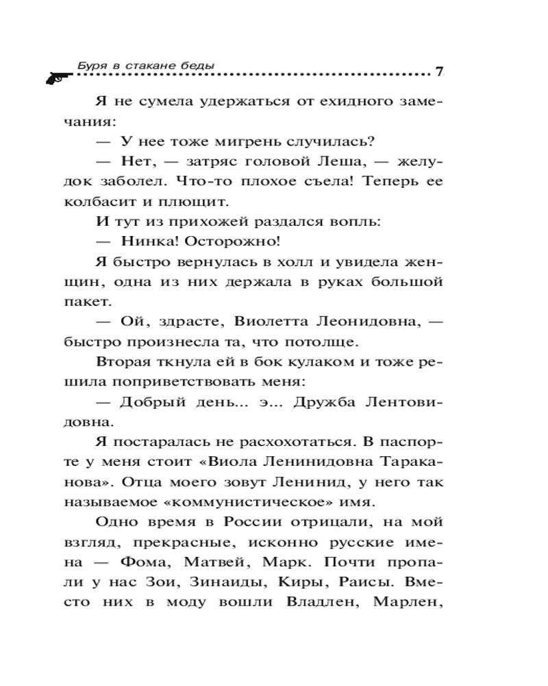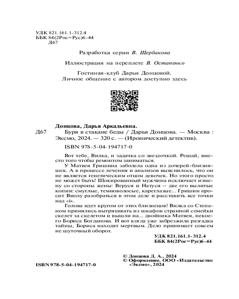 💳 Оплатить за товар можно при получении 🇰🇿 Есть бесплатная доставка по Казахстану от 1 дня 🎁 Копите бонусы с каждой покупки Серия: Иронический детектив Вот тебе, Вилка, и задачка со звездочкой. Решай, вместо того чтобы ремонтом заниматься. У Матвея Гришина заболела одна из дочерей-близняшек. А в процессе лечения и анализов выяснилось, что он не является генетическим отцом девочек. Но этого просто не может быть! Шокированный мужчина исключает измену со стороны жены: Веруся и Натуся — две его вылитые копии: смуглые, темноволосые, кареглазые... Гришин просит Виолу разобраться в этом деле и расставить все точки над «i». |