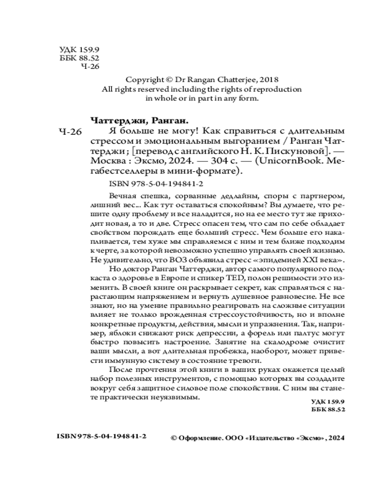 💳 Оплатить за товар можно при получении 🇰🇿 Есть бесплатная доставка по Казахстану от 1 дня 🎁 Копите бонусы с каждой покупки Серия: UnicornBook. Мега-бестселлеры в мини-формате Большие города, высокие скорости, постоянный информационный шум... неудивительно, что около 70% людей, посещающих психолога, жалуются именно на стресс. Доктор Ранган Чаттерджи, автор самого популярного подкаста о здоровье в Европе и спикер TED, знает: чтобы справиться с нарастающим напряжением и эмоциональным выгоранием, не нужно уезжать подальше от цивилизации и избавляться от любых раздражителей. Нет, стресс — всего лишь реакция, которая возникает внутри и поддается корректировке. Поэтому, лишь немного изменив подход к своему телу, сознанию, отношениям и целям, мы с удивлением обнаружим, как прекрасен мир вокруг нас и как мало вещей, на которые на самом деле стоит тратить свои нервы. |