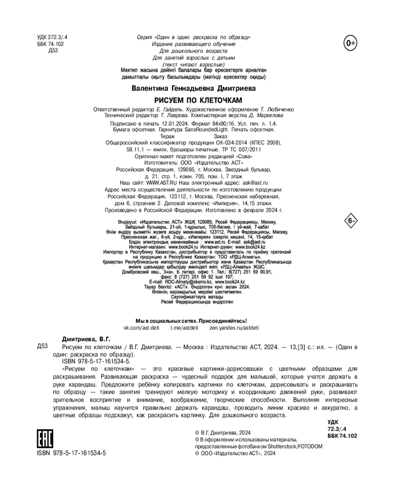 💳 Оплатить за товар можно при получении 🇰🇿 Есть бесплатная доставка по Казахстану от 1 дня 🎁 Копите бонусы с каждой покупки Серия: Один в один: раскраска по образцу «Рисуем по клеточкам» — это красивые картинки-обводилки с цветными образцами для раскрашивания. Развивающая раскраска — чудесный подарок для малышей, которые учатся держать в руке карандаш. Предложите ребёнку копировать и дорисовывать картинки по клеточкам, обводить орнаменты и узоры — такие занятия тренируют мелкую моторику и координацию движений руки, развивают зрительное восприятие и внимание, воображение, творческие способности. Выполняя интересные упражнения, малыш научится правильно держать ручку и карандаш, проводить линии красиво и аккуратно, а цветные образцы подскажут, как раскрасить картинку. Рисовать по клеточкам и раскрашивать крупные картинки на плотной бумаге можно цветными карандашами, фломастерами, мелками. Для дошкольного возраста. |