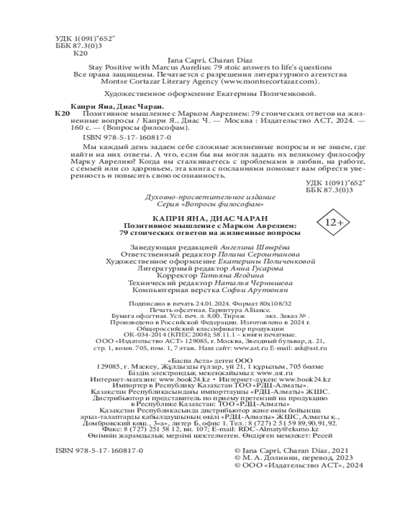 💳 Оплатить за товар можно при получении 🇰🇿 Есть бесплатная доставка по Казахстану от 1 дня 🎁 Копите бонусы с каждой покупки Серия: Вопросы философам Мы каждый день задаем себе сложные жизненные вопросы и не знаем, где найти на них ответы. А что, если бы вы могли задать их великому философу Марку Аврелию? Когда вы сталкиваетесь с проблемами в любви, на работе, с семьей или со здоровьем, эта книга с посланиями поможет вам обрести уверенность и повысить свою осознанность. |