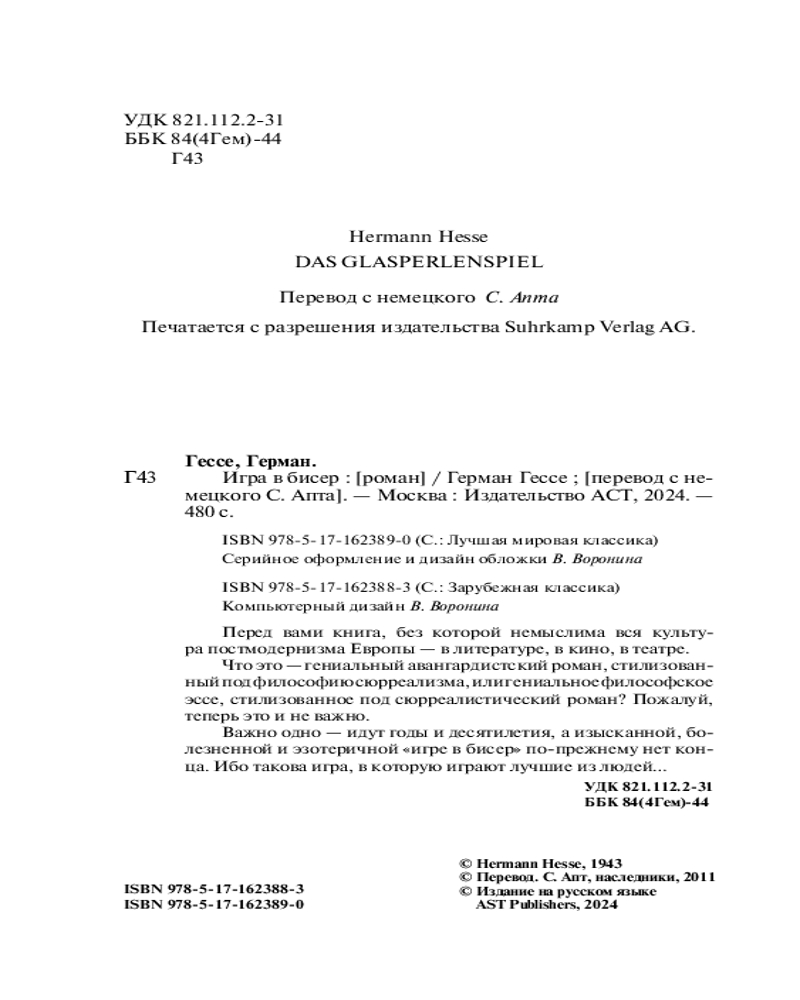 Игра в бисерВ данный момент этот товар отсутствует в продаже. Возможно, у нас найдется аналогичный или похожий товар здесь. Серия: Лучшая мировая классика Перед вами — книга, без которой немыслима вся культура постмодернизма Европы — в литературе, в кино, в театре. Что это — гениальный авангардистский роман, стилизованный под философию сюрреализма, или гениальное философское эссе, стили-зованное под сюрреалистический роман? Пожалуй, теперь это и не важно. Важно одно — идут годы и десятилетия, а изысканной, болезненной и эзотеричной «игре в бисер» по-прежнему нет конца. Ибо такова игра, в которую играют лучшие из людей... |
