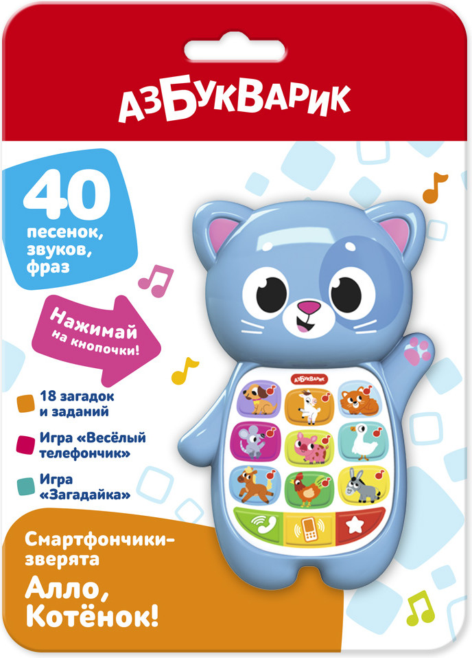 Азбукварик Игрушка музыкальная «Алло, Котёнок!»В данный момент этот товар отсутствует в продаже. Возможно, у нас найдется аналогичный или похожий товар здесь. Серия: Смартфончики-зверята Необычный музыкальный смартфончик для малыша — в виде забавного Котёнка! Нажимая на кнопочки-иконки, ребенок послушает песенки про животных фермы, модные рингтоны и сможет поиграть в две увлекательные игры: игра «Весёлый телефончик» — малыш сможет звонить Котенку и его друзьям, и зверюшки ответят ему, игра «Загадайка» — ребенок будет отгадывать загадки и угадывать голоса зверят. Всего в смартфончике собрано 40 песенок, звуков, рингтонов, 18 загадок и заданий. Такая игрушка не только развлекает, но и развивает музыкальный слух, коммуникативные способности, воображение, мелкую моторику. |