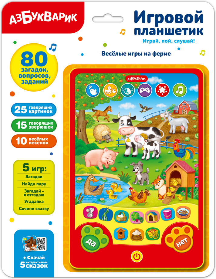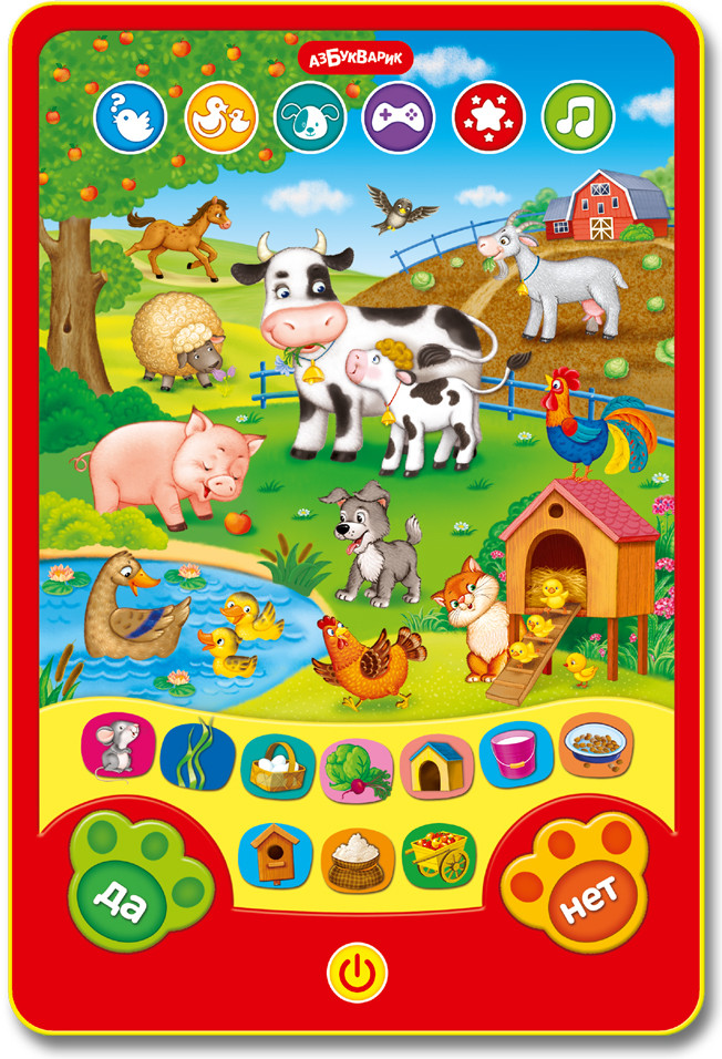 Серия: Игровой планшетик Этот компактный игровой планшетик прекрасно подойдет для всестороннего развития ребенка! Нажимая на кнопочки, малыш сможет поиграть со зверюшками фермы, послушать их песенки и даже сочинить про них сказку! Всего в планшетике собрано 80 вопросов и загадок, 25 говорящих картинок, 15 зверюшек, 10 песенок, 5 игр («Чей голос?», «Найди пару», «Сочини сказку», «Загадай — я отгадаю» и «Загадки»). |