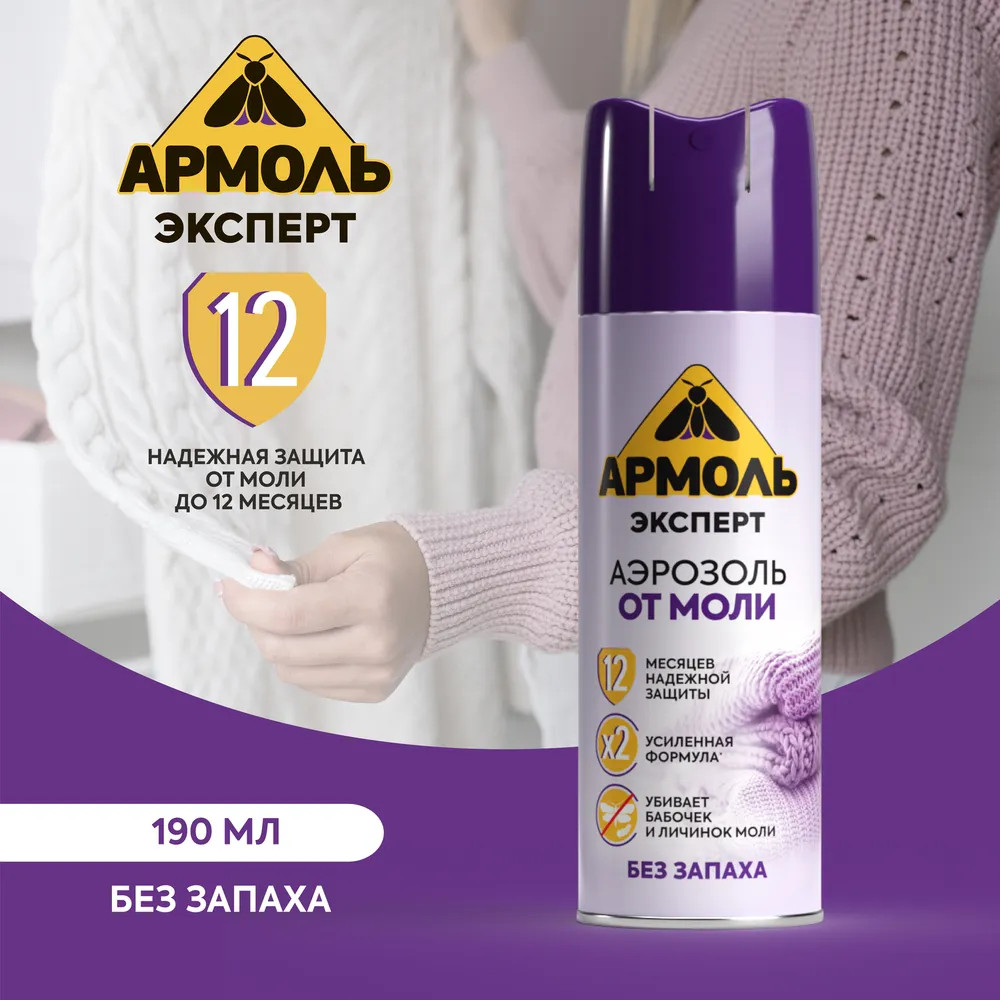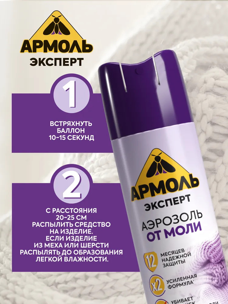 💳 Оплатить за товар можно при получении 🇰🇿 Есть бесплатная доставка по Казахстану от 1 дня 🎁 Копите бонусы с каждой покупки Аэрозоль от моли без запаха Армоль распыляется равномерно, без следов на одежде, белье и других вещах из шерсти, хлопка, акрила, ангоры, кашемира, органзы, деликатных тканей и других материалов, которые могут быть поражены молью. После обработки вещей против моли эффект длится 12 месяцев. |
