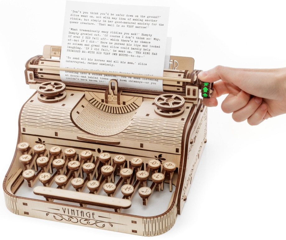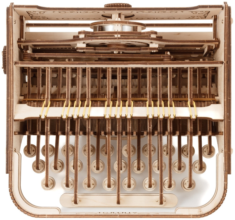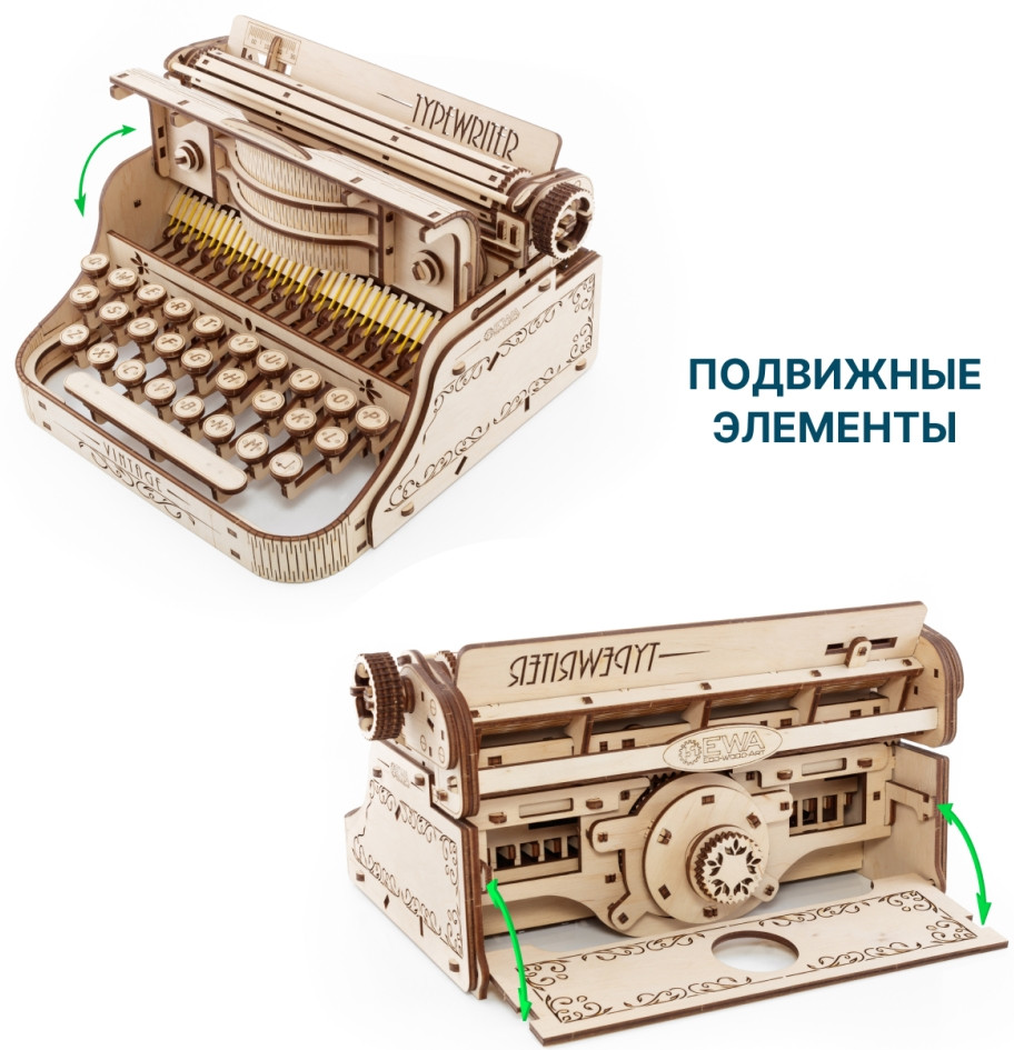 Деревянная модель сделана из натурального дерева без примеси вредных веществ и абсолютно безопасен для ребёнка. После сборки вы можете разрисовать сборную модель, что сделает процесс игры ещё более увлекательным. Конструктор механический, а это значит, что при нажатии на клавиши печати двигается каретка!