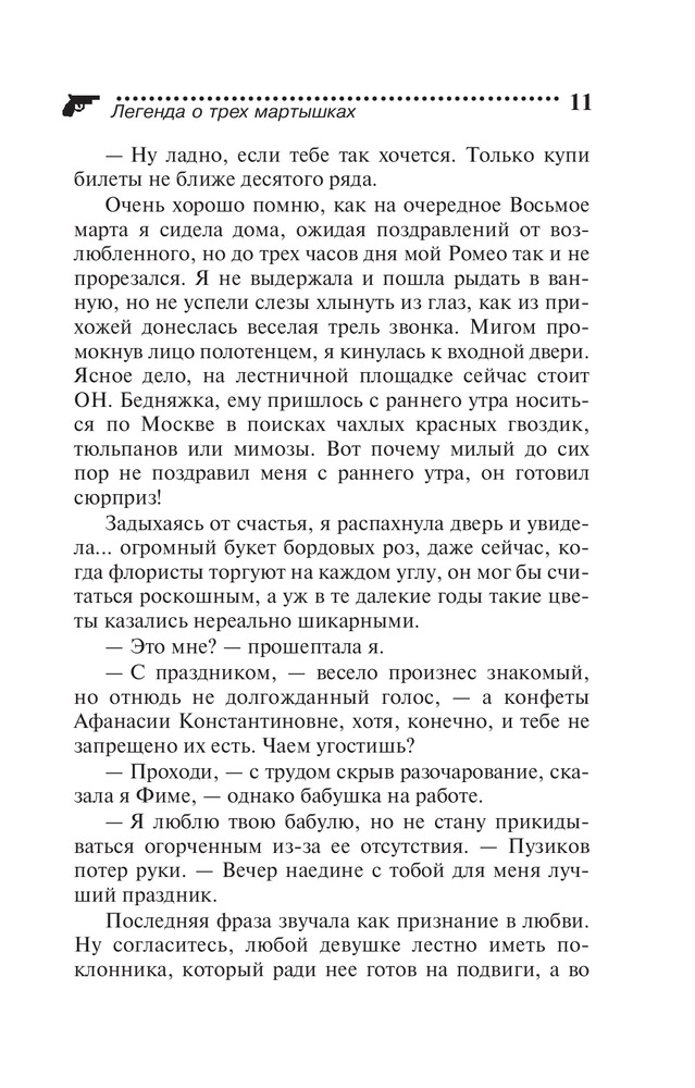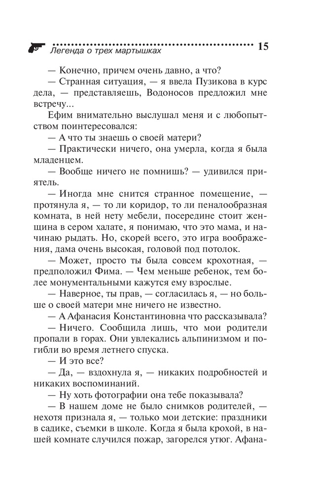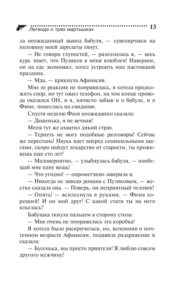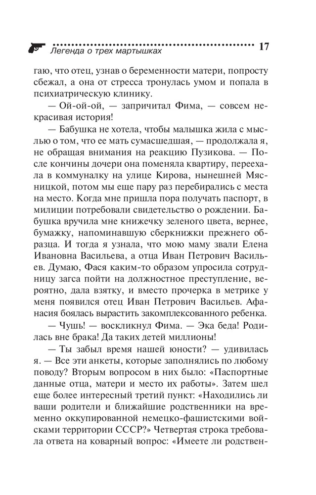 Легенда о трех мартышкахВ данный момент этот товар отсутствует в продаже. Возможно, у нас найдется аналогичный или похожий товар здесь. Множество тайн разгадала любительница частного сыска Даша Васильева. Теперь ей предстоит раскрыть еще одну — самую страшную и самую важную! Тайну ее семьи! Дашу воспитала бабушка Афанасия Константиновна. Она рассказывала, что родители девочки погибли в горах. Но спустя много лет выяснилось — во всей этой истории нет ни слова правды! А правда оказалась такой невероятной, что даже прошедшая огонь, воду и медные трубы Даша Васильева отказывается в нее верить!.. |