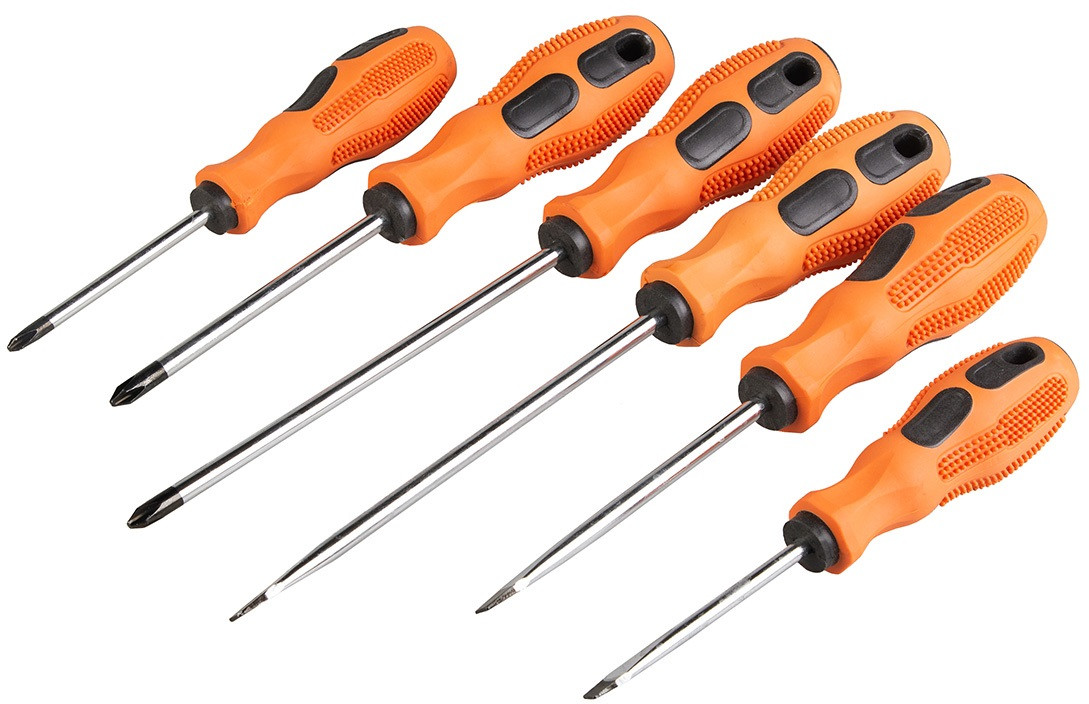 Набор отвертокВ данный момент этот товар отсутствует в продаже. Возможно, у нас найдется аналогичный или похожий товар здесь. Набор отверток 6 предметов в блистере (3 крестовые, 3 шлицевые) оранжевые — отвертки изготовлены из инструментальной стали S методом холодной штамповки. Двухкомпонентные ударопрочные ручки имеют прорезиненное покрытие, для удобства использования, защищая ладонь от проскальзывания. |