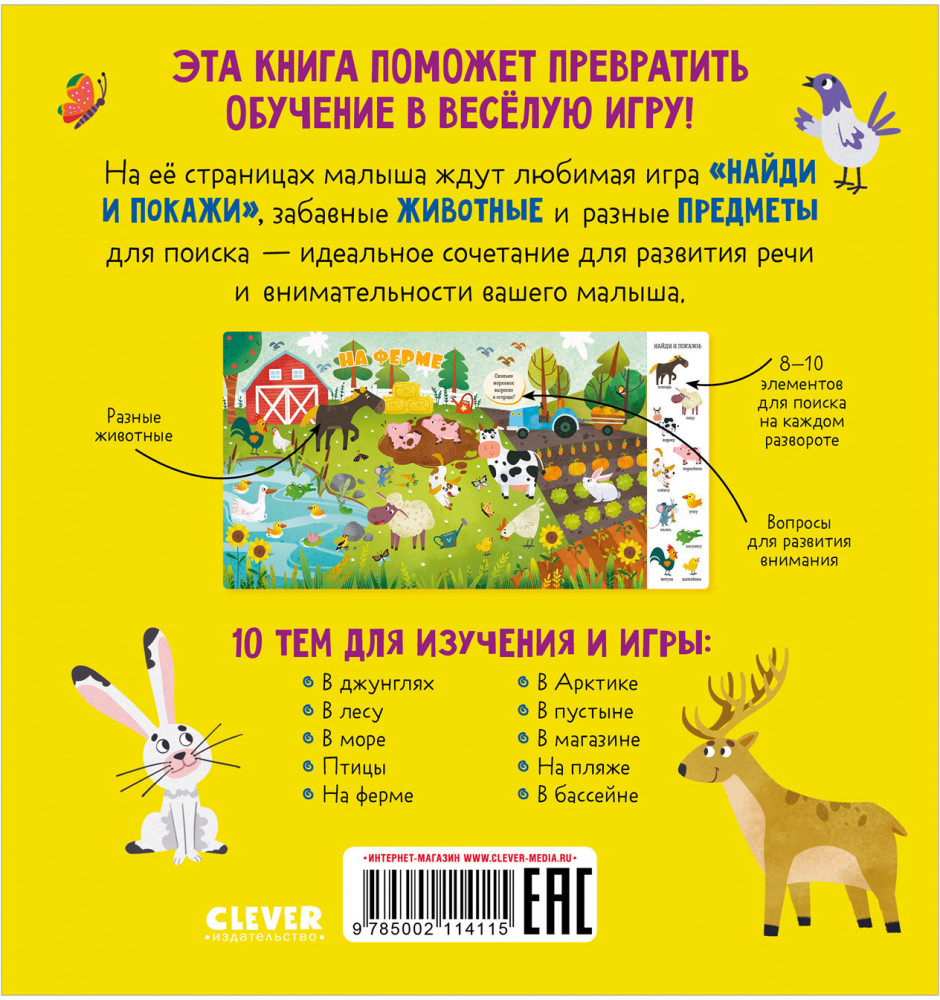 Найди и покажи, малыш. ЖивотныеВ данный момент этот товар отсутствует в продаже. Возможно, у нас найдется аналогичный или похожий товар здесь. Серия: Найди и покажи, малыш Эта книга поможет превратить обучение в веселую игру! На её страницах малыша ждут любимая игра «Найди и покажи», забавные животные и разные предметы для поиска — идеальное сочетание для развития речи и внимательности вашего малыша. |