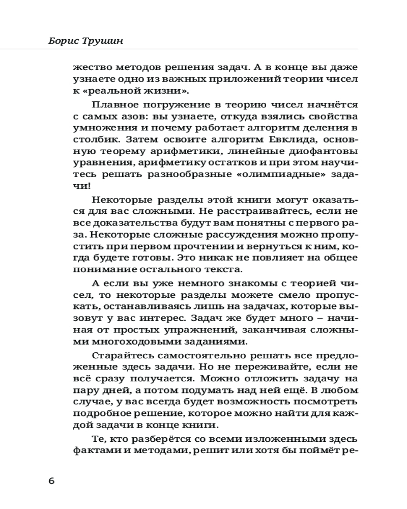 💳 Оплатить за товар можно при получении 🇰🇿 Есть бесплатная доставка по Казахстану от 1 дня 🎁 Копите бонусы с каждой покупки Серия: Математика с Борисом Трушиным От автора: «Книга рассчитана на широкий круг читателей — от шестиклассников до людей, давно окончивших школу. В ней я собрал многолетний опыт преподавания теории чисел школьникам на уроках, кружках и факультативах. Книга позволяет познакомиться с теорией чисел и освоить азы этого интересного раздела математики без каких-либо предварительных знаний. В этой книге я попытался, начав с базовых принципов работы с целыми числами, пройти путь до содержательных теорем, по дороге осваивая множество методов решения задач. А в конце вы даже узнаете одно из важных приложений теории чисел к „реальной жизни“». |