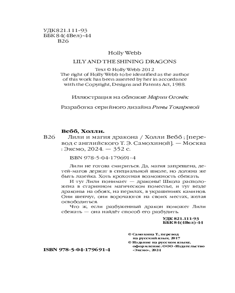 💳 Оплатить за товар можно при получении 🇰🇿 Есть бесплатная доставка по Казахстану от 1 дня 🎁 Копите бонусы с каждой покупки Серия: Детск. Холли Вебб. Лили и тайны волшебников Этот дом волшебный? Здесь повсюду драконы, драконы и ещё раз драконы. Они притаились на обоях, лестничных решётках, в украшениях каминов. Лили кажется, что она слышит их шёпот, они хотят проснуться. Но её сестра Джорджи не верит ей. Магия запрещена, а значит, и в доме её нет. Только Лили уверена — чтобы драконы вновь появились в их мире, нужен лишь один маленький толчок... |