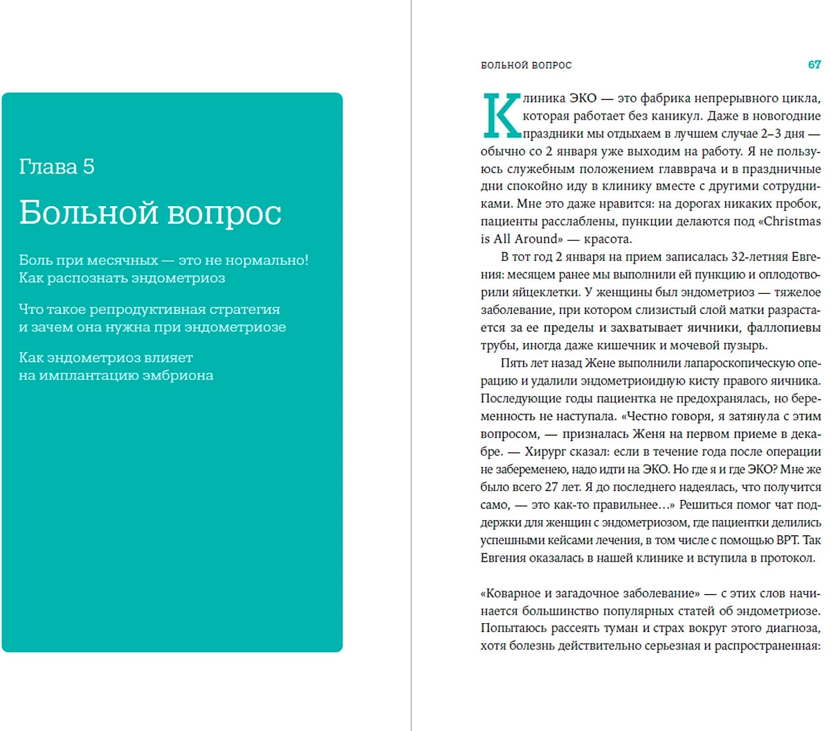 «Я хочу, чтобы эта книга стала опорой для людей, которые ждут своего ребенка — месяц, год, 10 или 15 лет; чтобы она избавила от ощущения одиночества перед лицом репродуктивных трудностей. И конечно, стала источником знаний о том, как происходит зачатие, каковы этапы ЭКО, какие репродуктивные технологии можно ожидать в скором будущем, как повысить шансы на успех и стоит ли обращаться к альтернативным методам лечения».