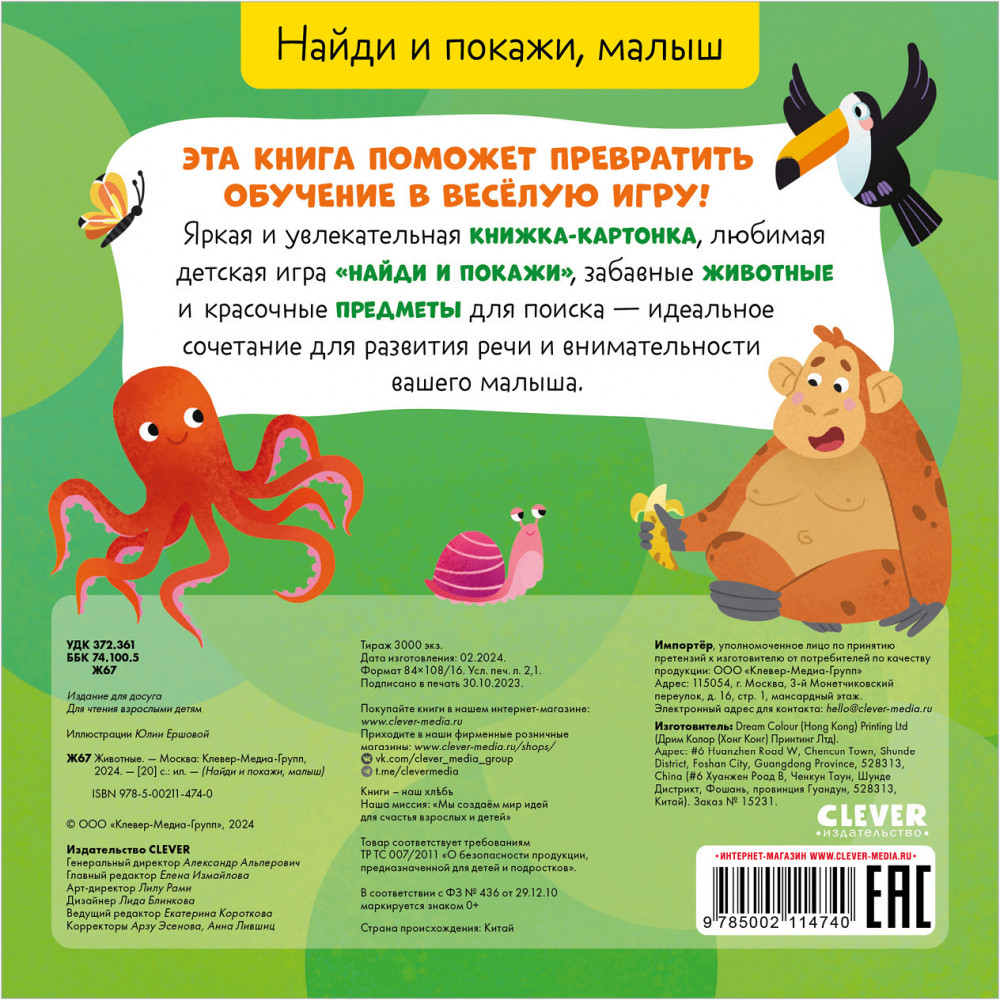 Найди и покажи, малыш. ЖивотныеВ данный момент этот товар отсутствует в продаже. Возможно, у нас найдется аналогичный или похожий товар здесь. Серия: Найди и покажи, малыш Эта книга поможет превратить обучение в веселую игру! Яркая и увлекательная книжка-картонка, любимая детская игра «найди и покажи», забавные животные и красочные предметы для поиска — идеальное сочетание для развития речи и внимательности вашего малыша. |