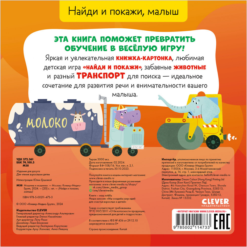 Найди и покажи, малыш. Машины и машинкиВ данный момент этот товар отсутствует в продаже. Возможно, у нас найдется аналогичный или похожий товар здесь. Серия: Найди и покажи, малыш Эта книга поможет превратить обучение в веселую игру! Яркая и увлекательная книжка-картонка, любимая детская игра «найди и покажи», забавные животные и разный транспорт для поиска — идеальное сочетание для развития речи и внимательности вашего малыша. |