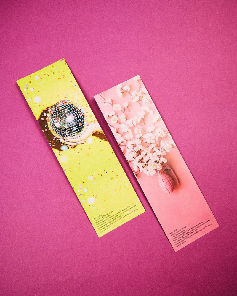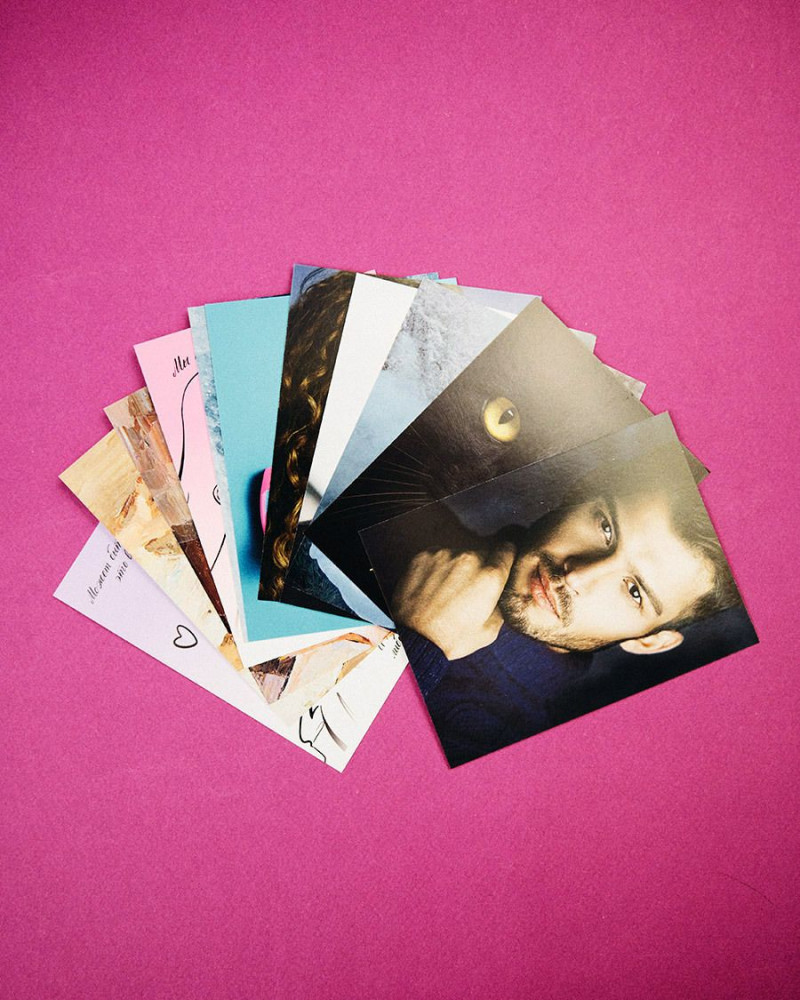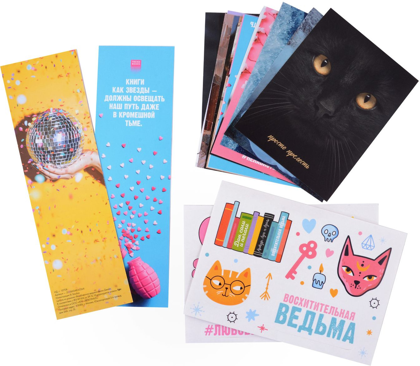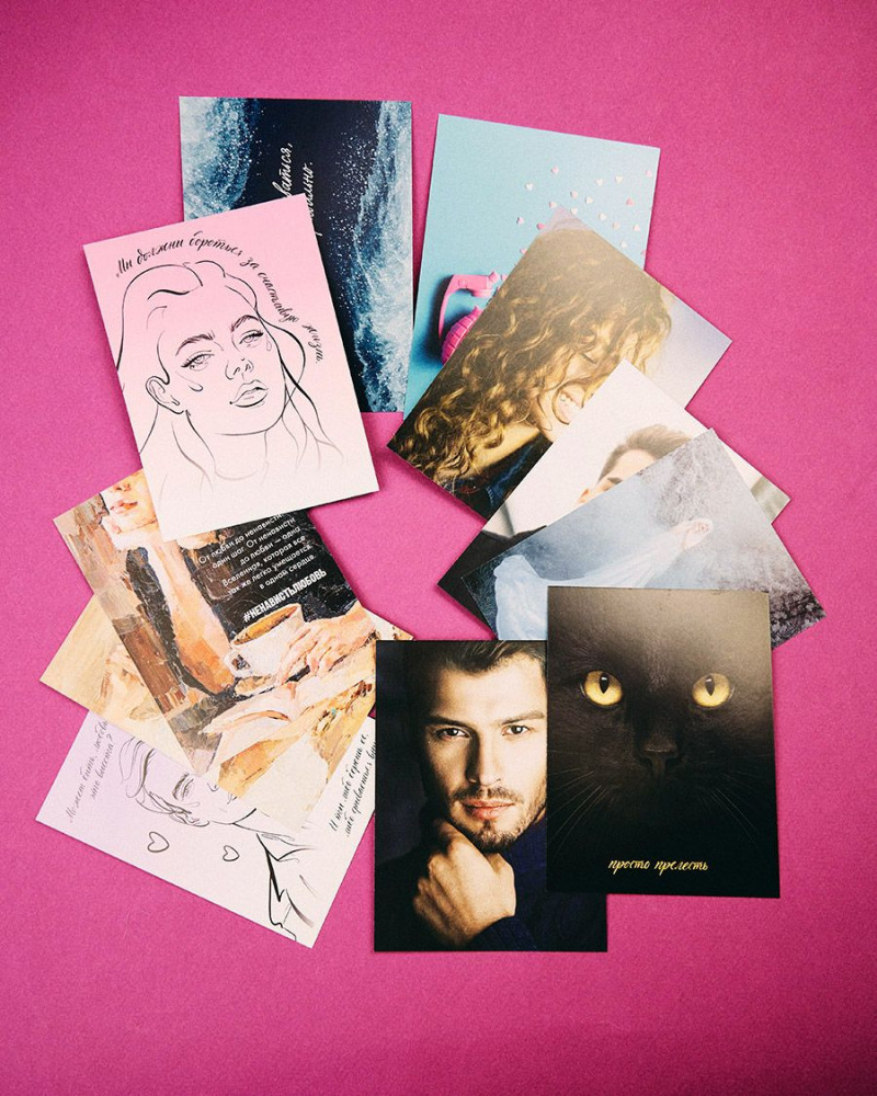 • двенадцать открыток по романам с изображениями героев и их цитатами, формат — 90×120 мм.