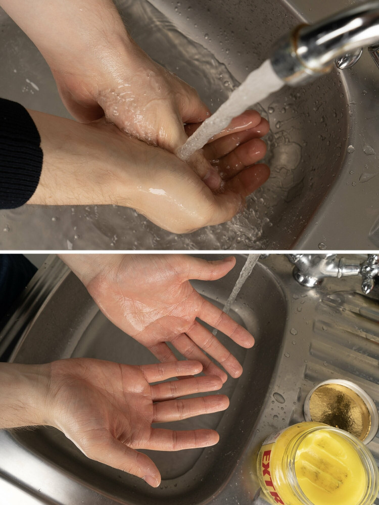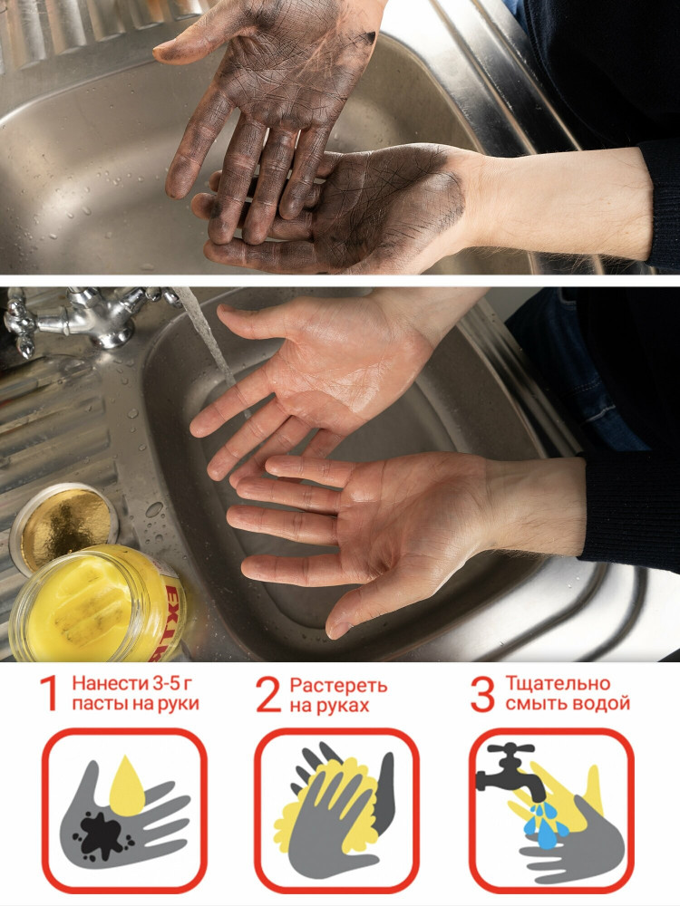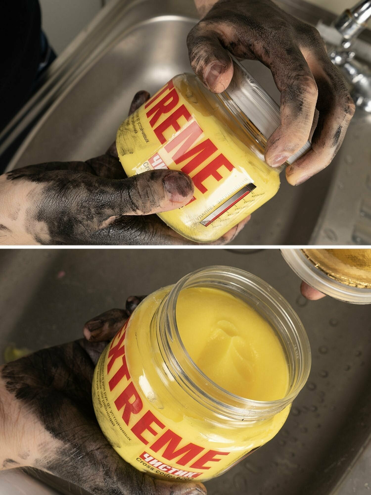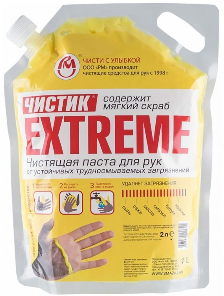 Вода, парафины фр. С14-С17, диэтанлоамиды жирных кислот кокосового масла, лаурет сульфат натрия, порошок полиэтилена, ароматизатор, тартразин желтый E-102.