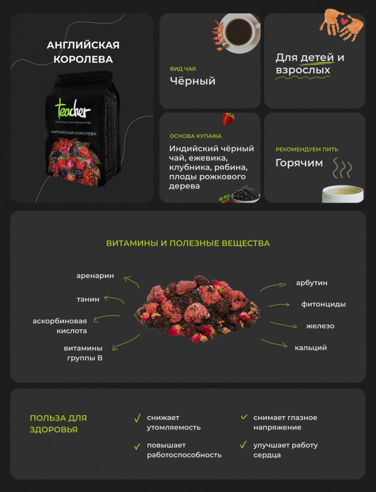 Teacher Чай листовой «Английская королева»В данный момент этот товар отсутствует в продаже. Возможно, у нас найдется аналогичный или похожий товар здесь. Ароматный купаж из ягод, плодов рожкового дерева и розовых бутонов на основе цейлонского черного чая, ставшего классикой для традиционного британского чаепития. Чай Английская Королева покоряет утонченным сочетанием терпкости и нежности. Вас ждут приятная фруктовая сладость, изысканность цветов и аромат с глубокими древесными нотами. Настой насыщенного темно-шоколадного цвета оставляет долгое бархатистое послевкусие и поднимает настроение. Идеально сочетается с выпечкой и легкими десертами. |