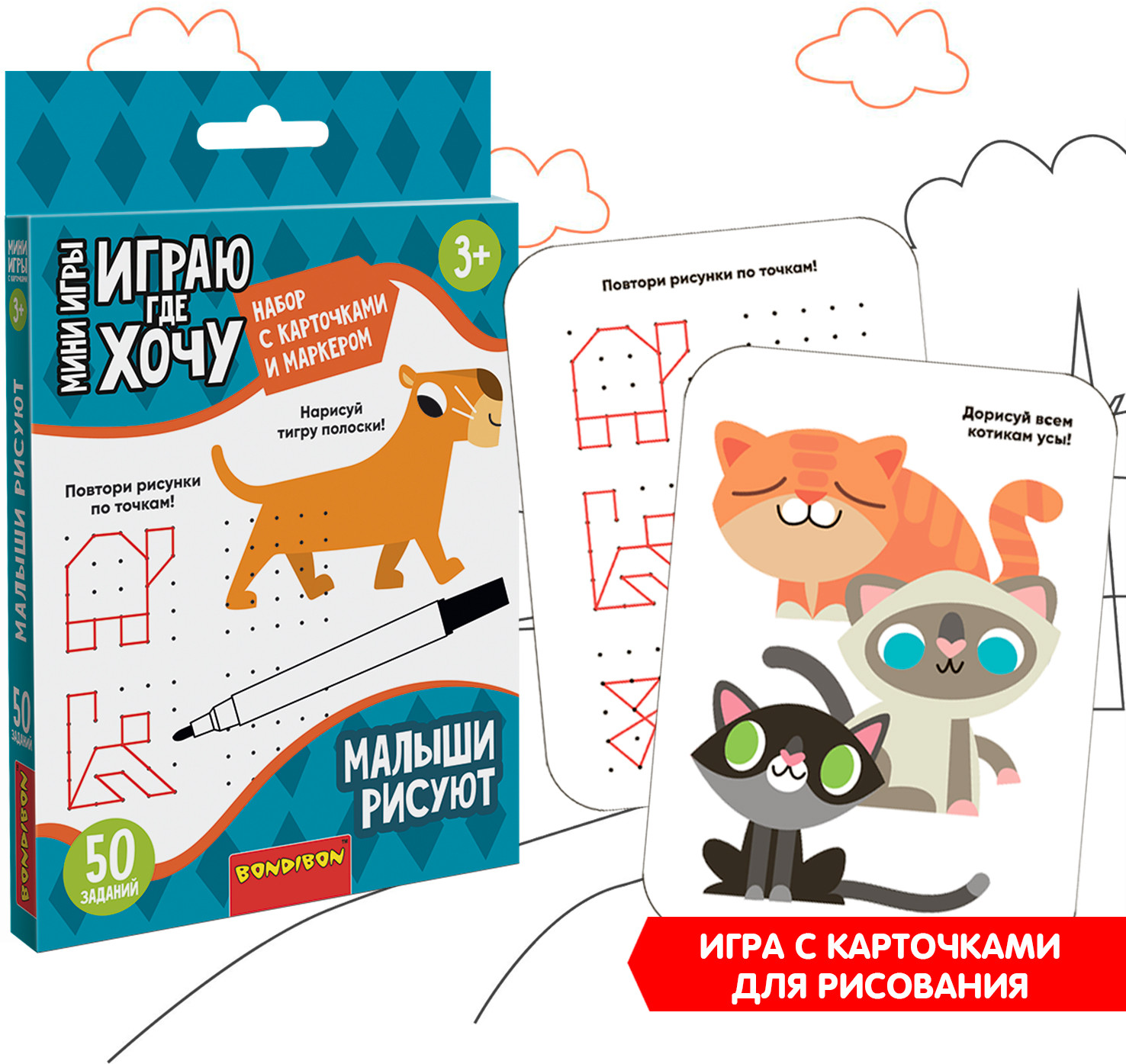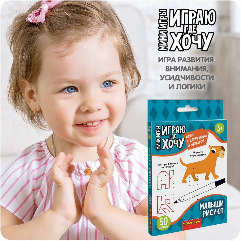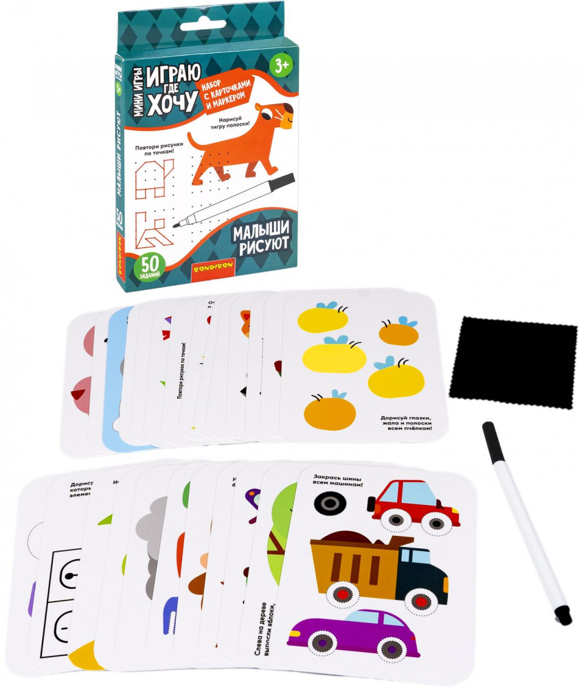 В комплект входит 50 заданий на ламинированных картах, маркер и салфетка. Очень важно развивать у ребенка внимание, усидчивость и логику. С мини-играми «Играю где хочу» от Bondibon эта возможность всегда с Вами! Красочные и компактные, они станут идеальными спутниками для маленького непоседы. Дома, на даче, в очереди, в поезде, самолете и машине — играйте где хочется!