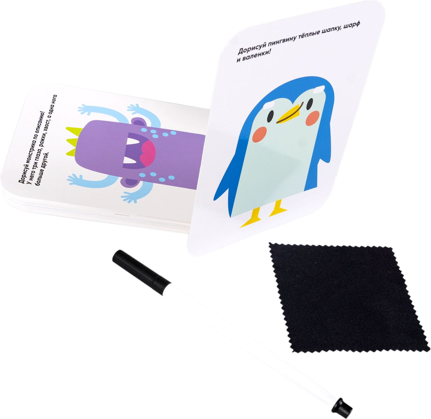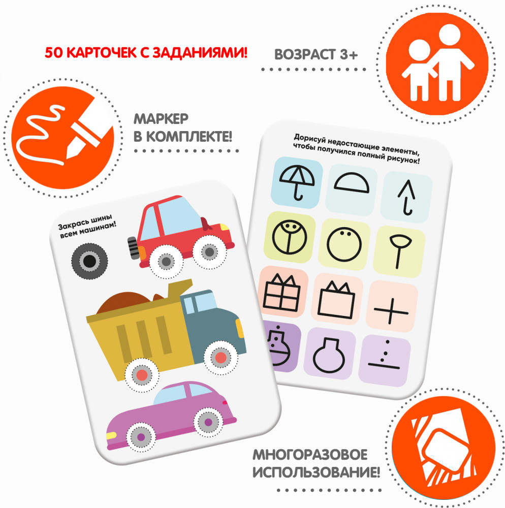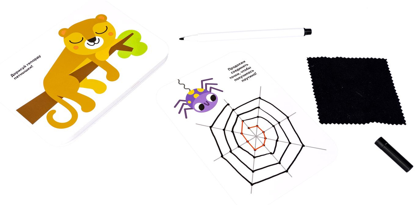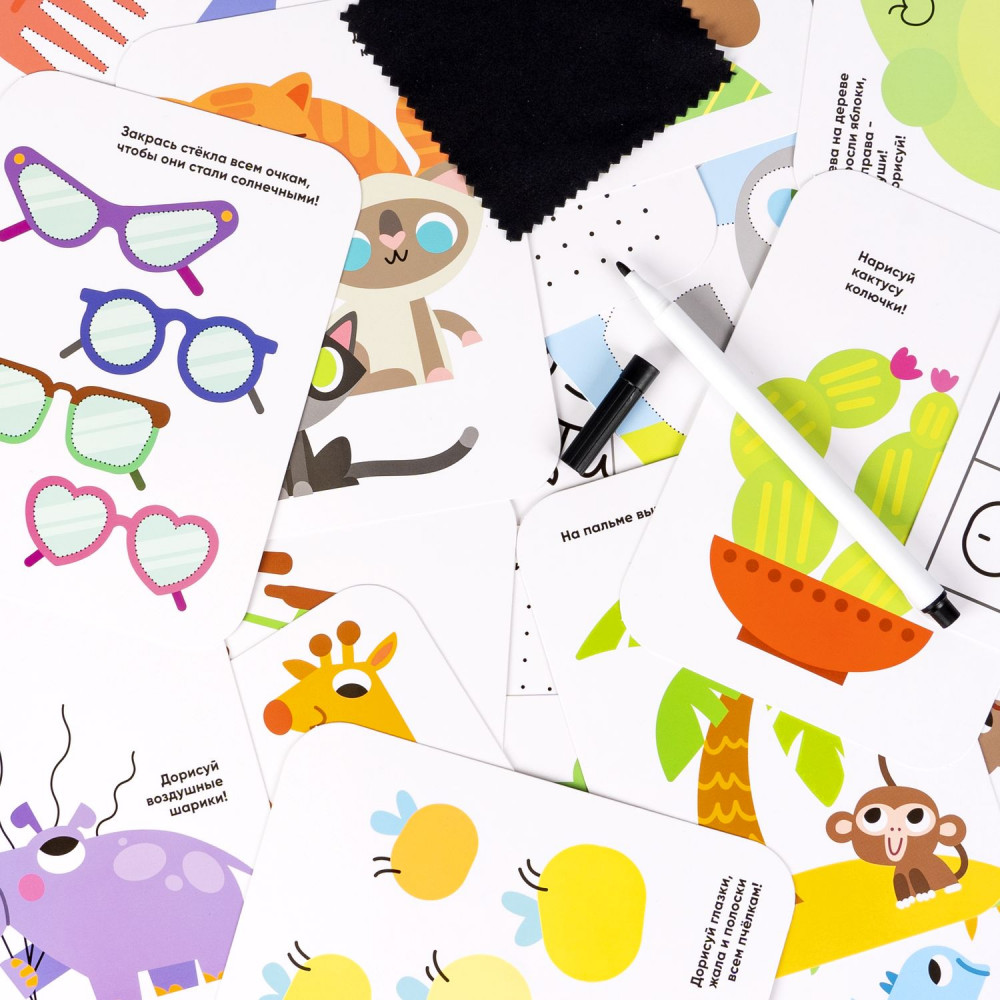 Малыши рисуют — это набор многоразовых карточек с заданиями на развитие моторики, пространственного мышления, внимания и плавная подготовка руки к письму. Соединение точек в отрезки, создание плавных контуров по пунктиру, раскрашивание фрагментов, не заходя за границы, задания на основе прописей помогут в оттачивании базовых навыков и порадуют вашего малыша забавными и милыми рисунками!
