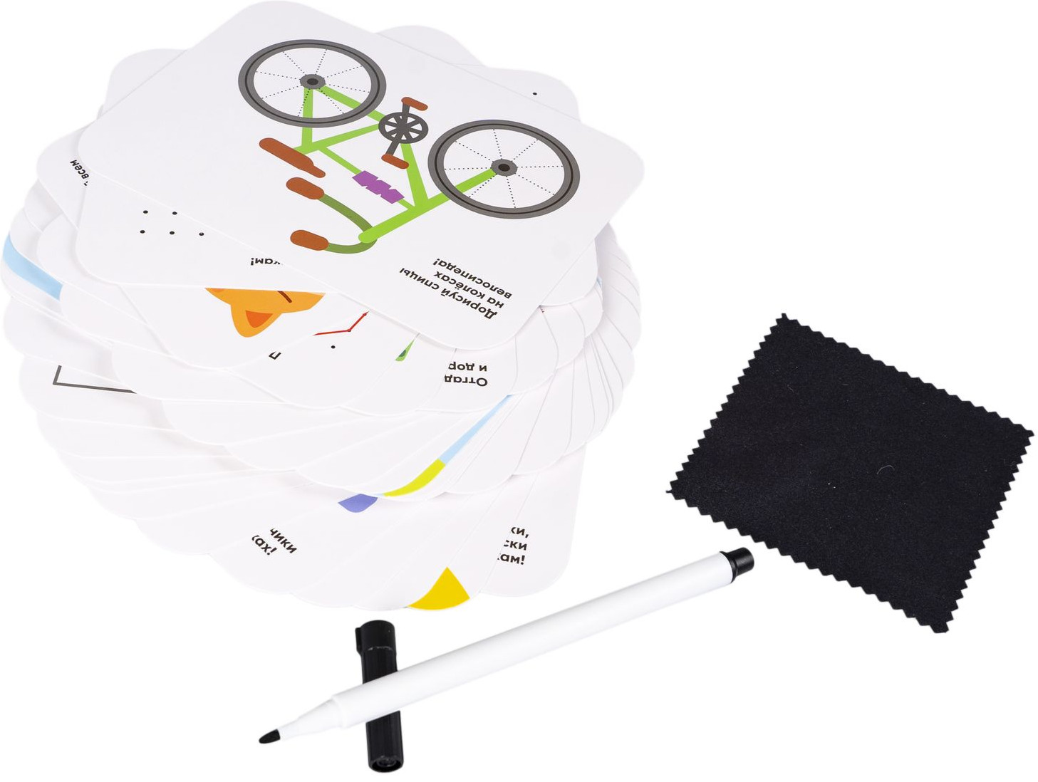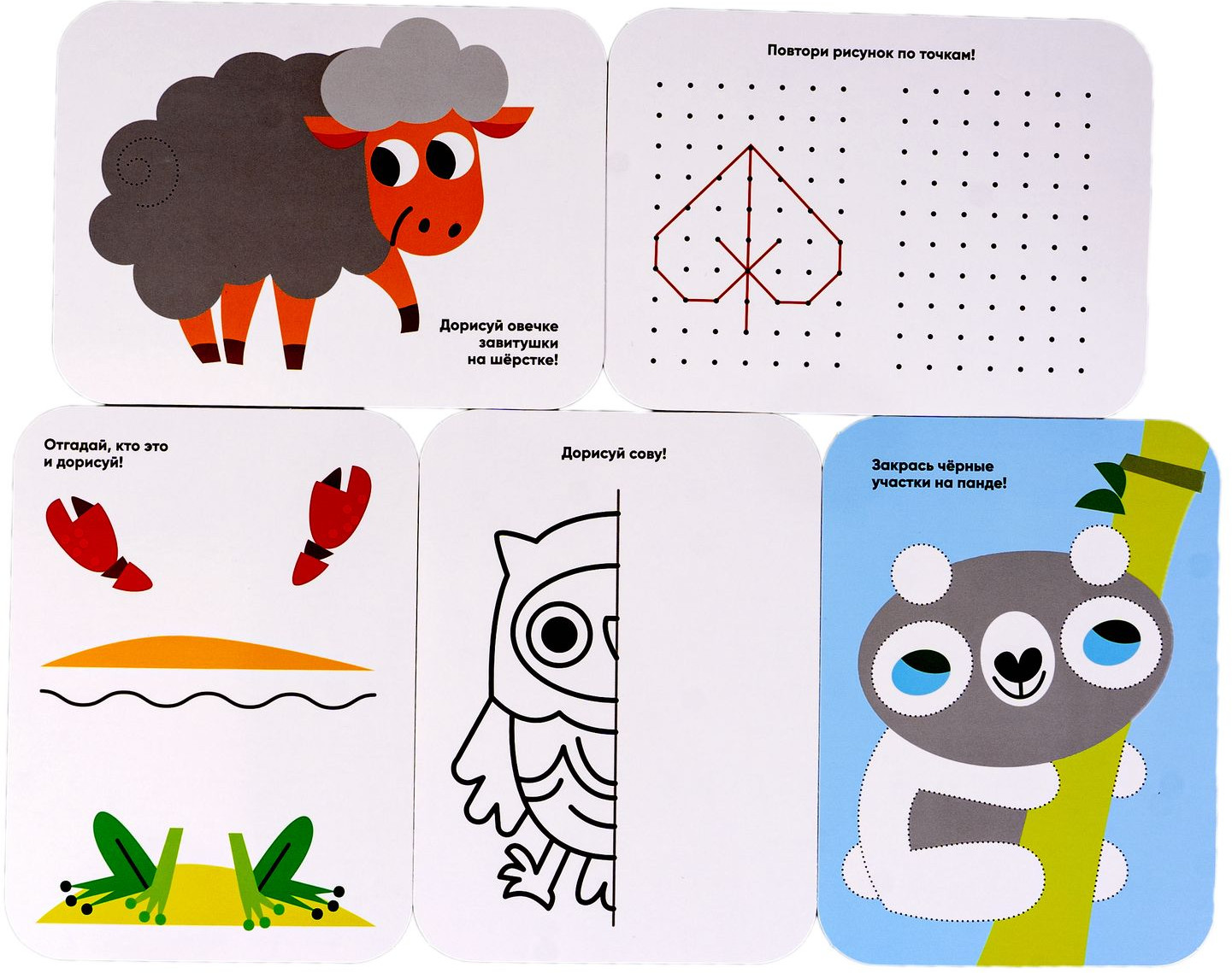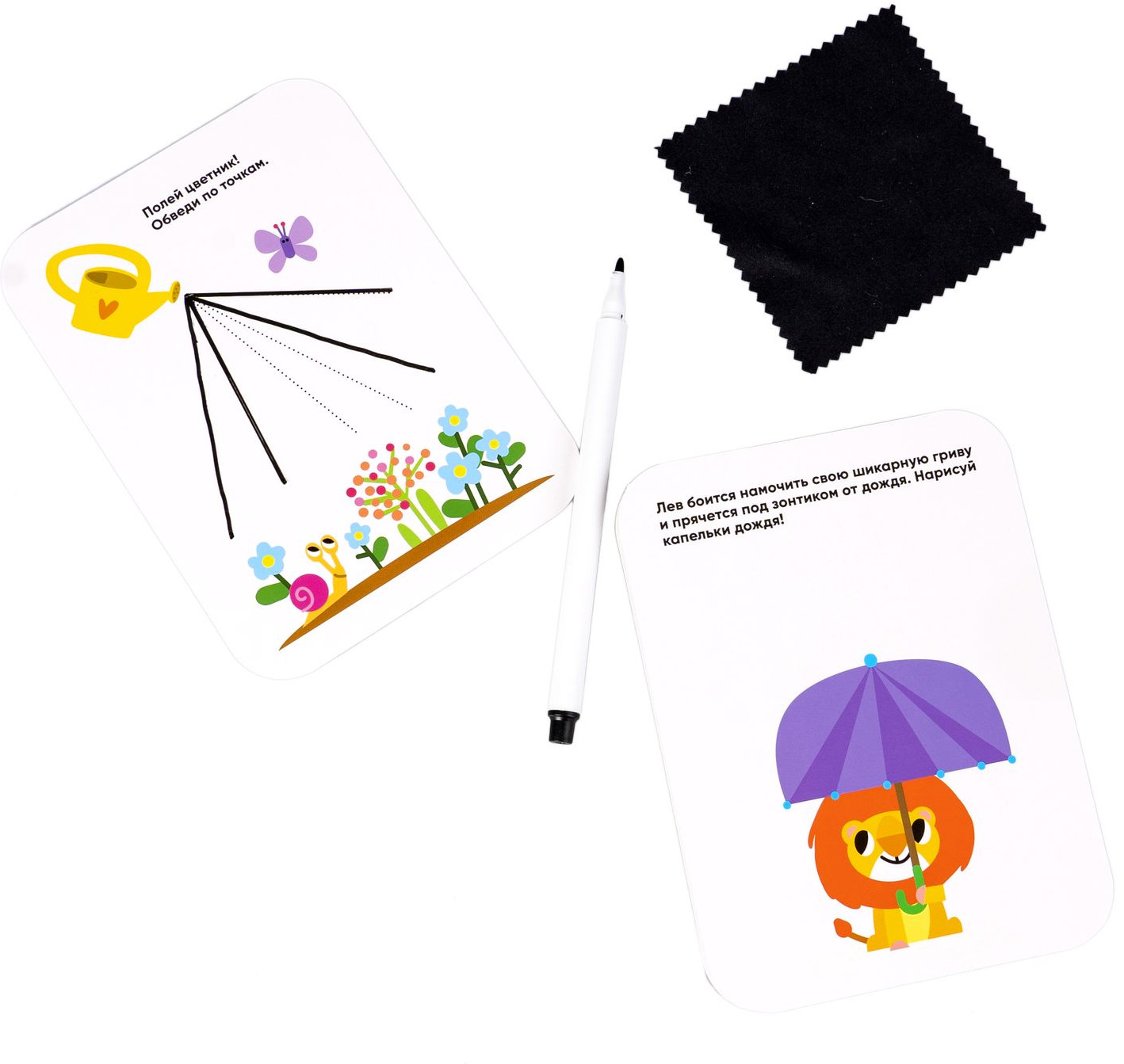 Малыши рисуют — это набор многоразовых карточек с заданиями на развитие моторики, пространственного мышления, внимания и плавная подготовка руки к письму. Соединение точек в отрезки, создание плавных контуров по пунктиру, раскрашивание фрагментов, не заходя за границы, задания на основе прописей помогут в оттачивании базовых навыков и порадуют вашего малыша забавными и милыми рисунками!