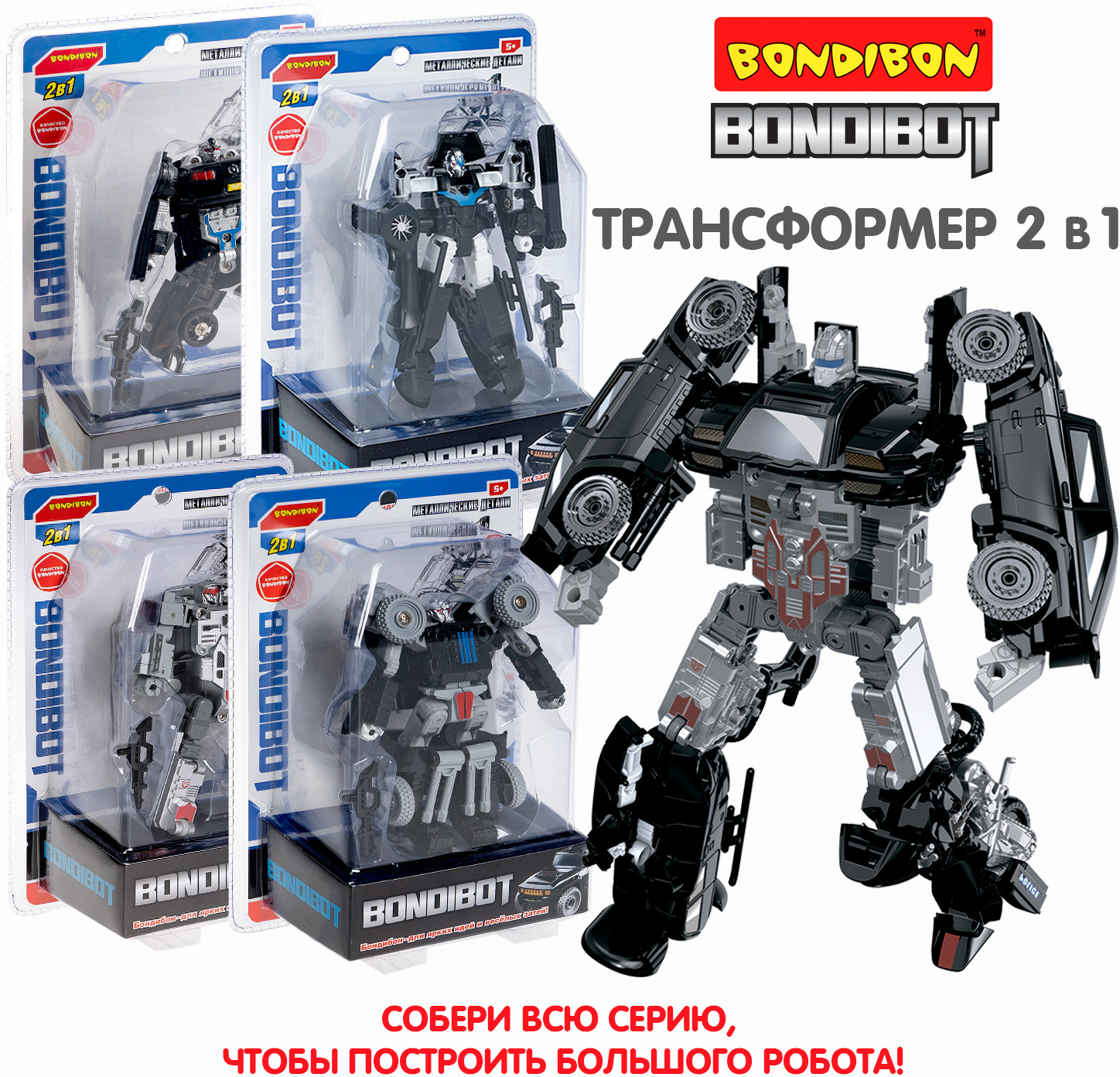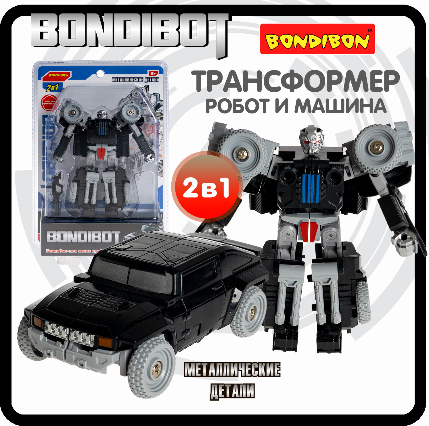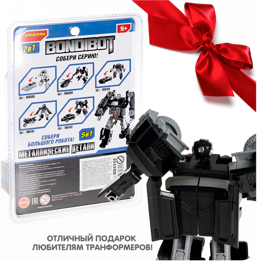 Bondibon Трансформер «Робот-внедорожник»В данный момент этот товар отсутствует в продаже. Возможно, у нас найдется аналогичный или похожий товар здесь. Серия: Bondibot Черный трансформер «Робот-внедорожник» 2в1 серии Bondibot от Bondibon непременно порадует маленьких любителей приключений. Две интересные игрушки в одной с металлическими деталями надолго увлекут ребенка. Соберите всю серию и сделайте большого робота 5 в 1! Превращайте бесстрашного воина в джип и обратно сколько угодно раз! Ведь у игрушки качественные металлические детали и прочные соединения. Фантазируйте и придумывайте захватывающие сюжеты! В процессе игры дети расширят кругозор, разовьют зрительно-моторную координацию движений, воображение и эмоциональный интеллект. Трансформер «Робот-внедорожник» 2в1 — замечательный подарок для мальчика. А из пяти моделей серии Вы сможете собрать большого робота, который вызовет у детей огромный восторг! О качестве и безопасности позаботился Бондибон. |