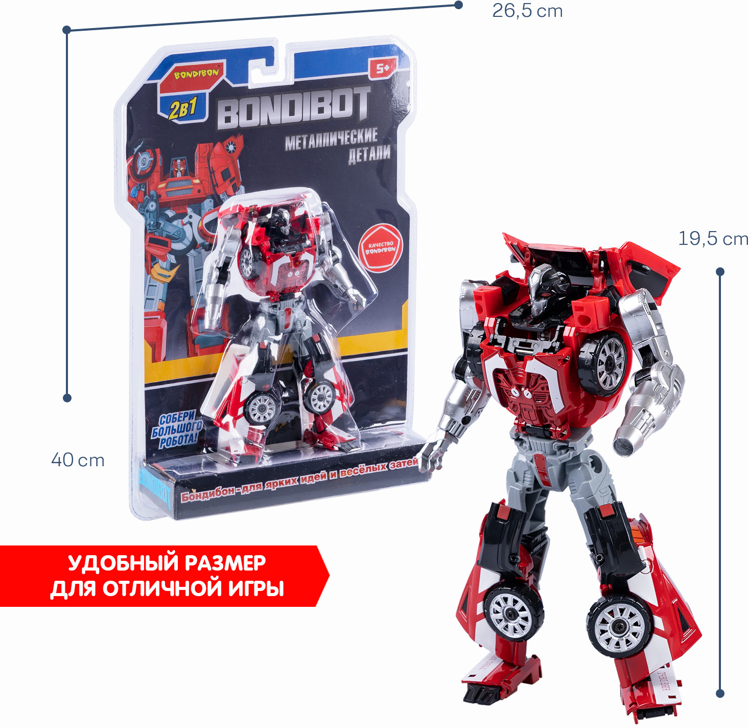 💳 Оплатить за товар можно при получении 🇰🇿 Есть бесплатная доставка по Казахстану от 1 дня 🎁 Копите бонусы с каждой покупки Серия: Bondibot Красный трансформер «Робот-пожарная машина» 2в1 серии Bondibot от Bondibon непременно порадует маленьких любителей техники. Две интересные игрушки в одной с металлическими деталями надолго увлекут ребенка. Соберите всю серию и сделайте большого робота 5 в 1! Превращайте бесстрашного воина в легковую пожарную машину и обратно сколько угодно раз! Ведь у игрушки качественные металлические детали и прочные соединения. Фантазируйте и придумывайте захватывающие сюжеты! В процессе игры дети расширят кругозор, разовьют зрительно-моторную координацию движений, воображение и эмоциональный интеллект. Трансформер «Робот-пожарная машина» 2в1 — замечательный подарок для мальчика. Пополните свою коллекцию пятью моделями серии и соберите большого робота, который вызовет у детей огромный восторг! О качестве и безопасности позаботился Бондибон. |